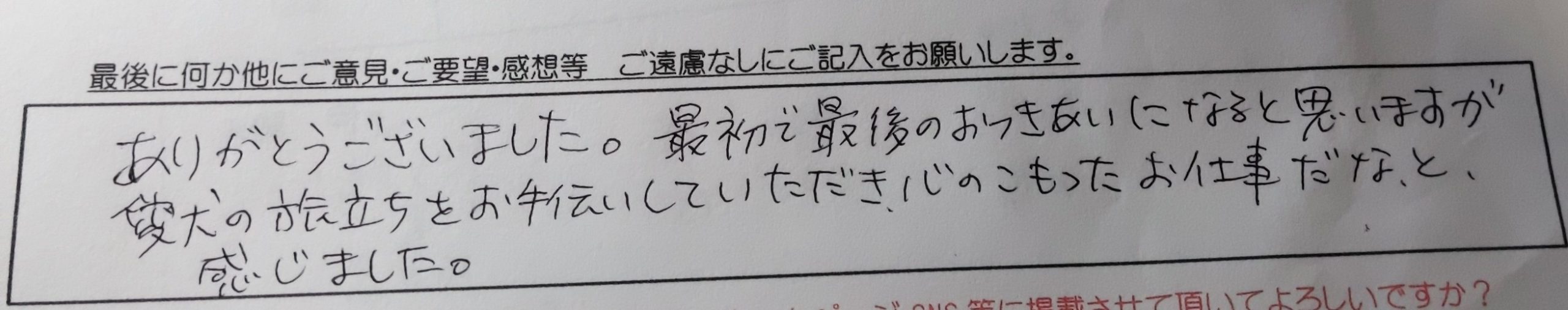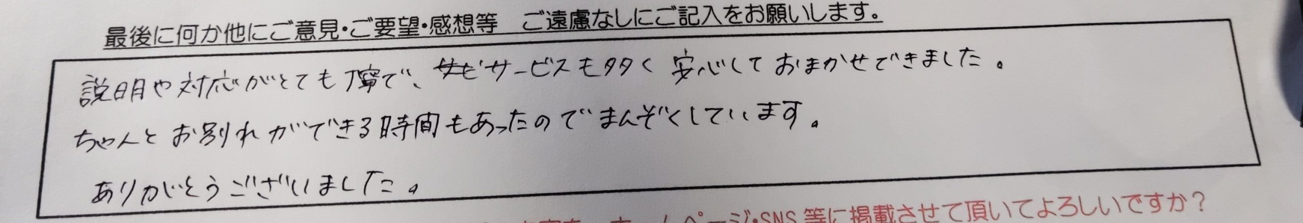 ありがとうございました。 最初で最後のおつきあいになると思いますが愛犬の旅立ちをお手伝いしていただき、心のこもったお仕事だなと感じました。