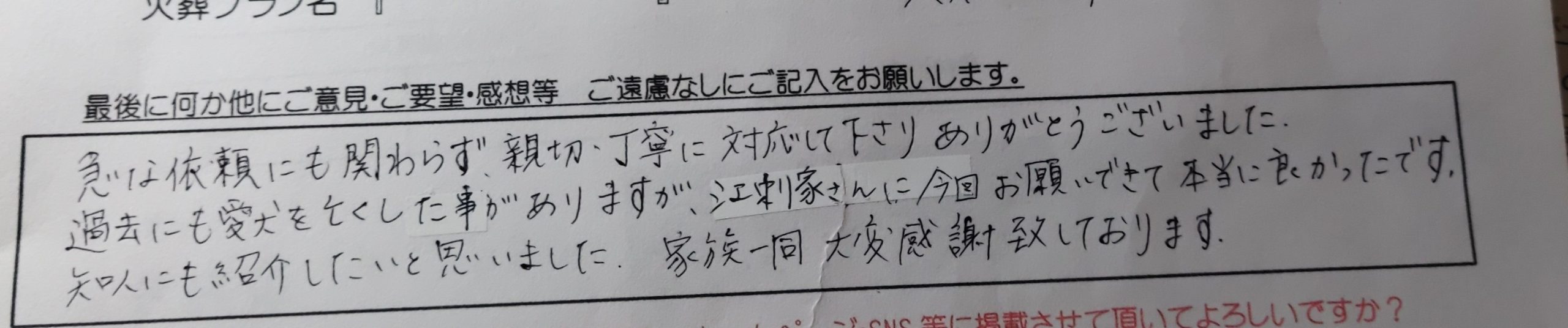 急な依頼にも関わらず、親切丁寧に対応して下さりありがとうございました。過去にも愛犬を亡くしたことがありますが、江刺家さんに今回お願いできて本当に良かったです。 知人にも紹介したいと思いました。 家族一同大変感謝しております。