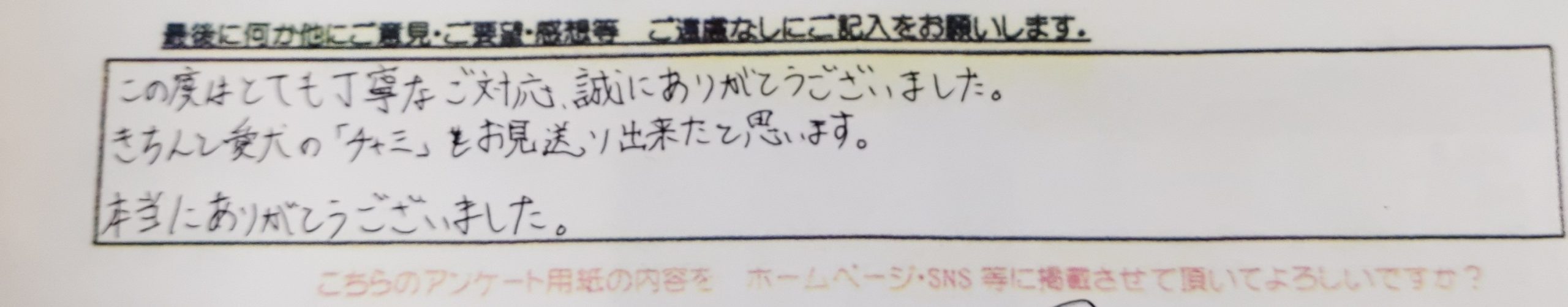 この度はとても丁寧な対応、ありがとうございました。 きちんと愛犬の「チャミ」をお見送り出来たと思います。 本当にありがとうございました。