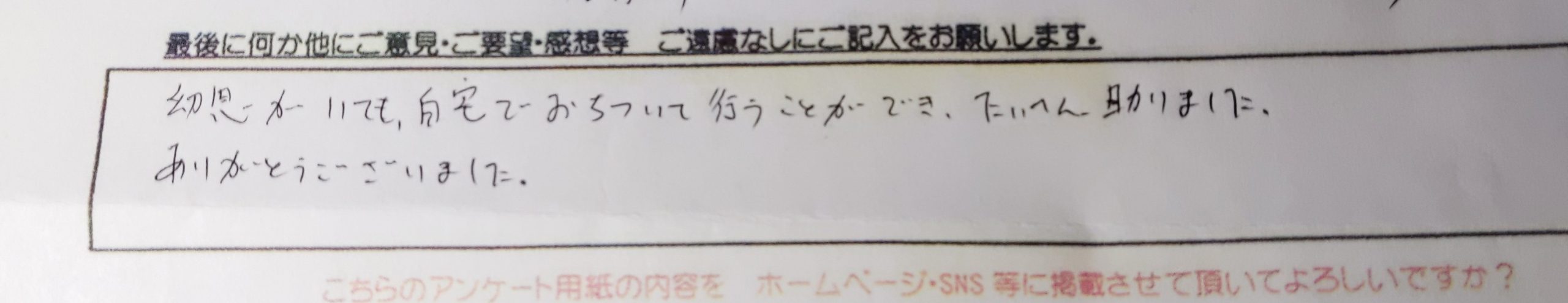 幼児がいても、自宅でおちついて行うことができ、たいへん助かりました。 ありがとうございました。