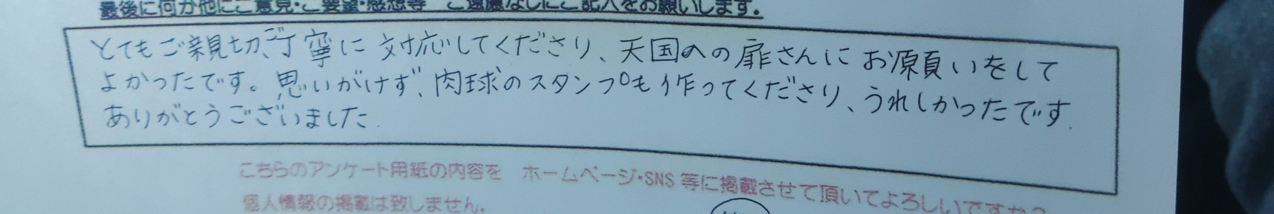 急な対応にも、優しく対応して頂き、感謝しています。 最後のお別れを自宅でできた事、本当にありがとうございました。