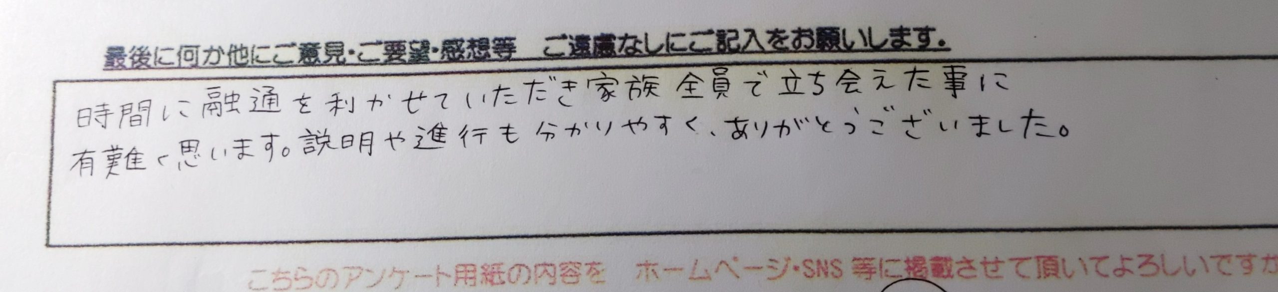 時間に融通を利かせていただき家族全員で立ち会えた事に 有難く思います。 説明や進行も分かりやすく、ありがとうございました。