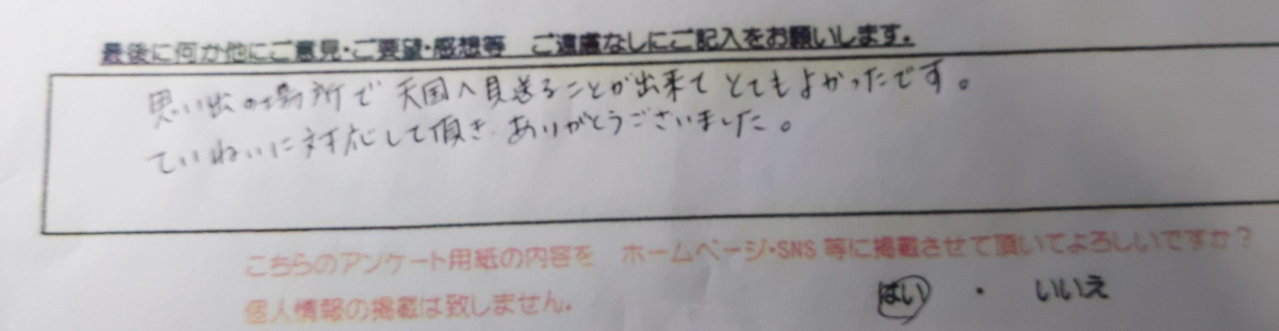 思い出の場所で天国へ見送ることが出来てとても良かったです。 ていねいに対応して頂き、ありがとうございました。