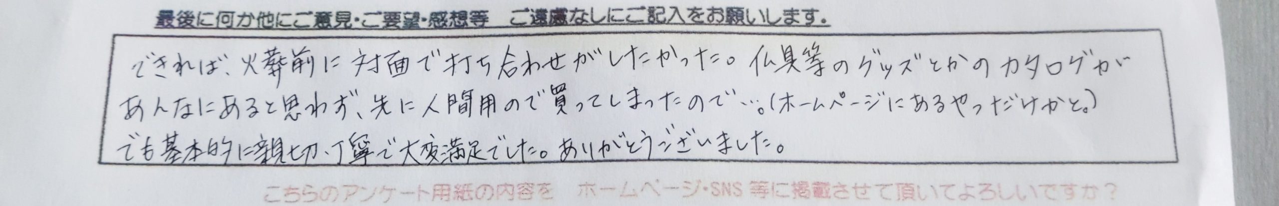 できれば、火葬前に対面で打ち合わせがしたかった。仏具等のグッズとかのカタログがあんなにあると思わず、先に人間用ので買ってしまったので・・・。(ホームページにあるやつだけかと。) でも基本的に親切、丁寧で大変満足でした。