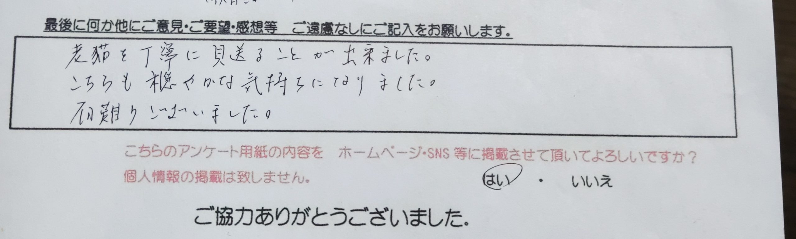 老猫を丁寧に見送る事が出来ました。 こちらも穏やかな気持ちになりました。 有難うございました。