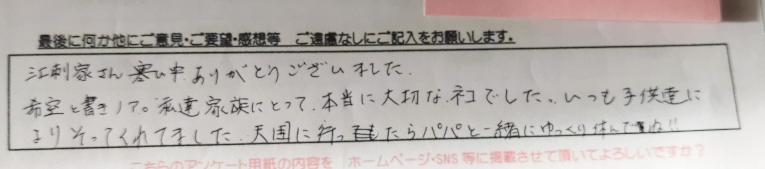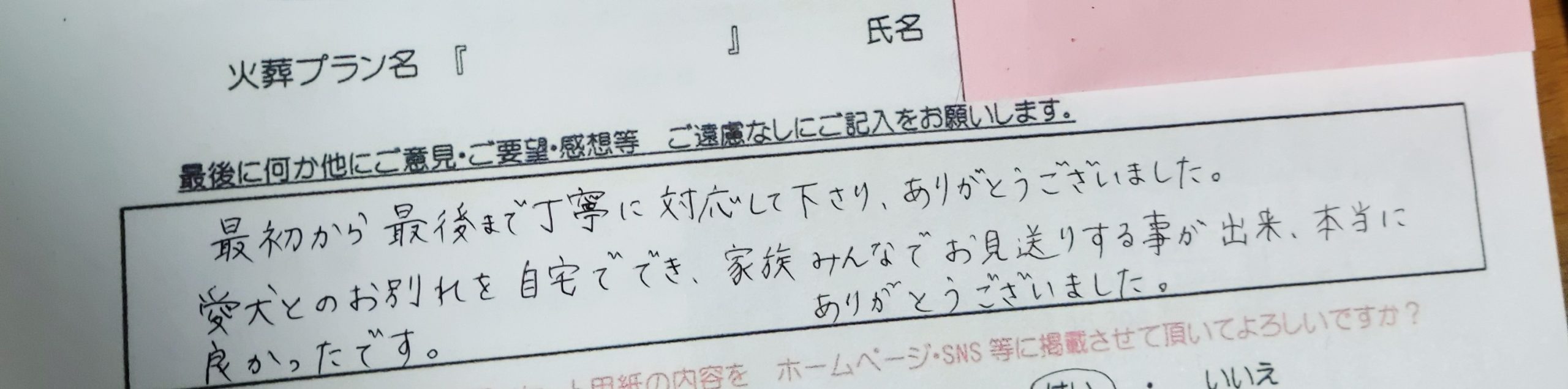 最初から最後まで丁寧に対応して下さり、ありがとうございました。 愛犬とのお別れを自宅ででき、家族みんなでお見送りする事が出来、本当に良かったです。