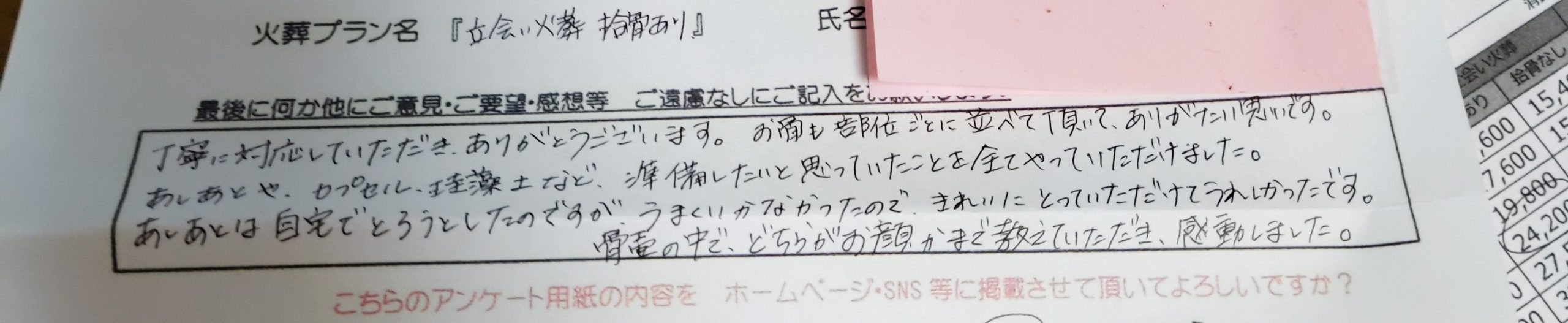 丁寧に対応していただき、ありがとうございます。 お骨も部位ごとに並べて頂いて、ありがたい思いです。 あしあとや、カプセル、珪藻土など、準備したいと思っていたことを全てやっていただけました。 あしあとは自宅でとろうとしたのですが、うまくいかなかったので、きれいにとっていただけてうれしかったです。 骨壺の中で、どちらが、お顔かまで教えていただき、感動しました。