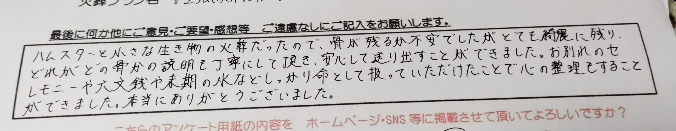 ハムスターと小さな生き物の火葬だったので、骨が残るか不安でしたがとても綺麗に残り、どれがどの骨かの説明も丁寧にして頂き、安心して送り出すことができました。 お別れのセレモニーや六文銭や末期の水などしっかり命として扱っていただけたことで心の整理もすることができました。本当にありがとうございました。