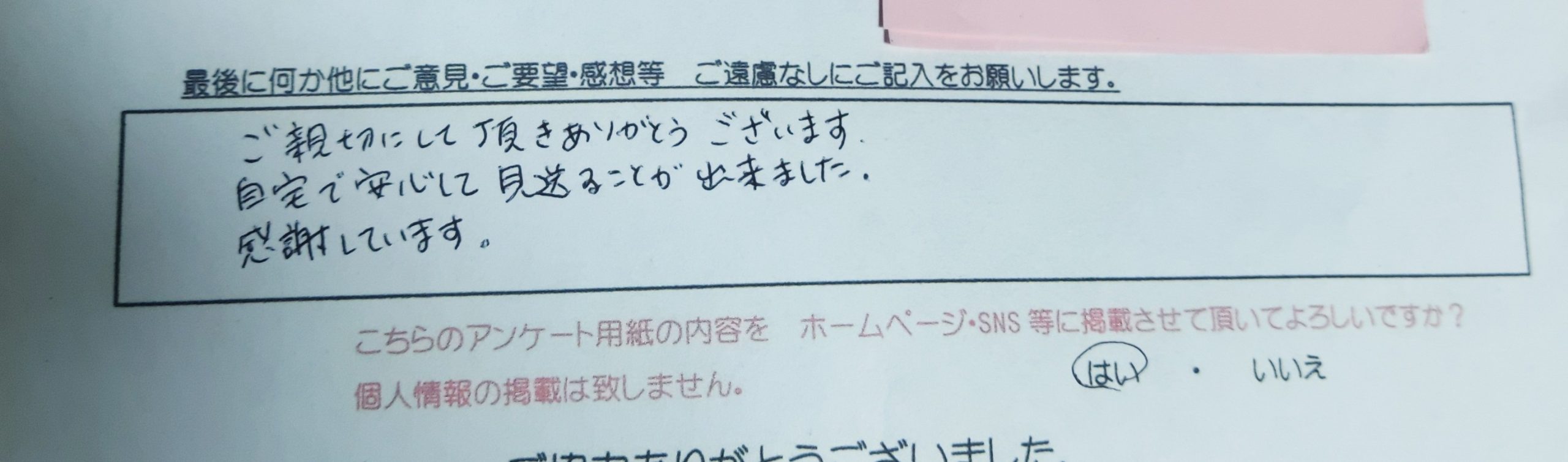 ご親切にして頂きありがとうございます。 自宅で安心して見送る事ができました。 感謝しています。