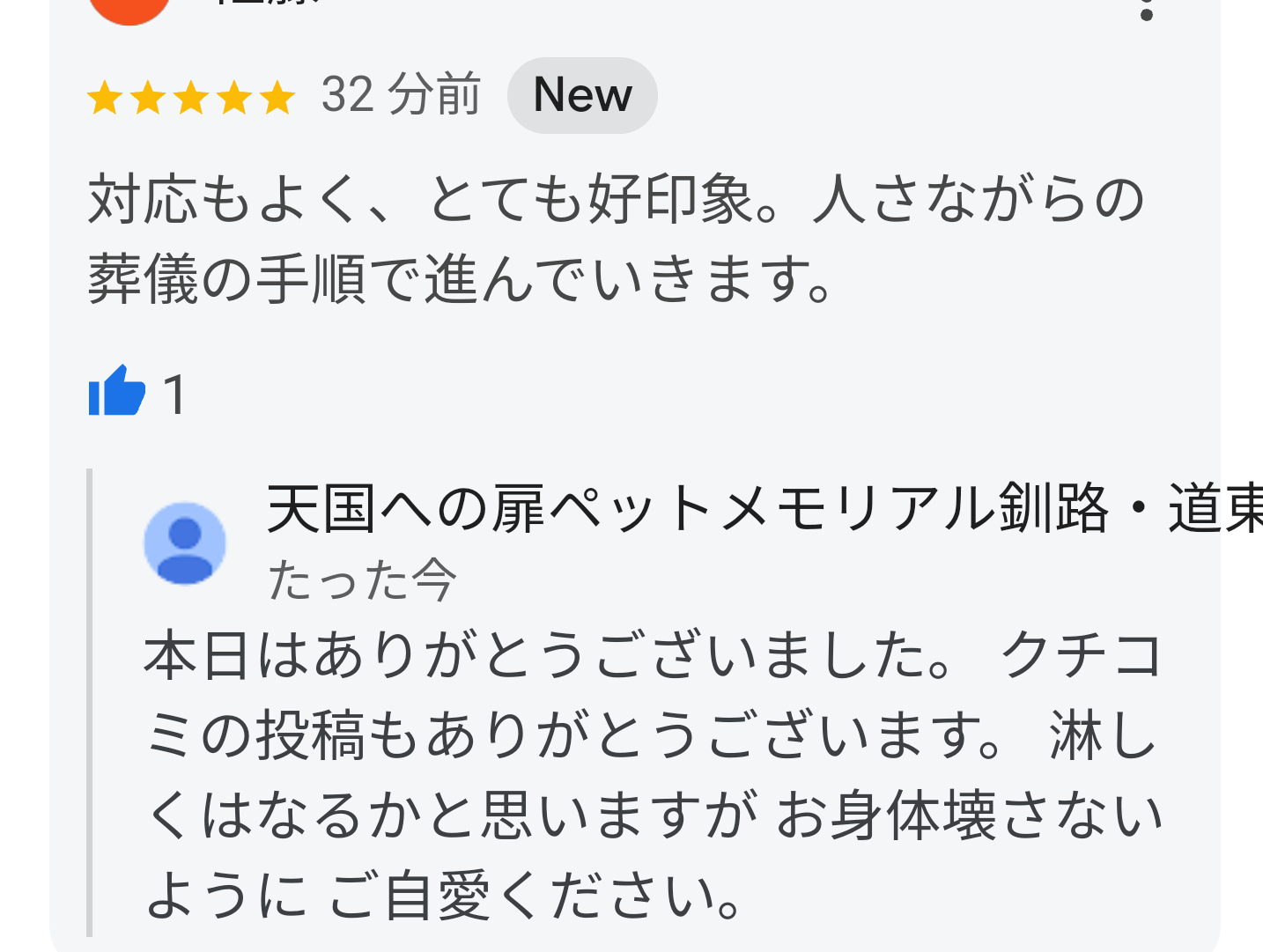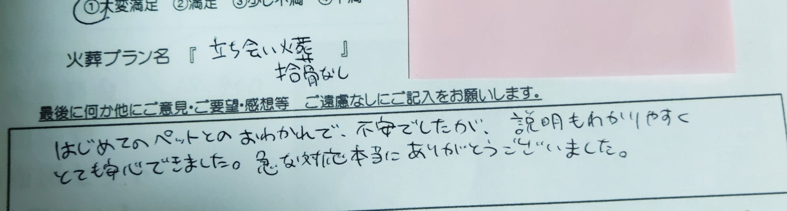 はじめてのペットとの おわかれで、不安でしたが、説明もわかりやすく とても安心できました。 急な対応本当にありがとうございました。