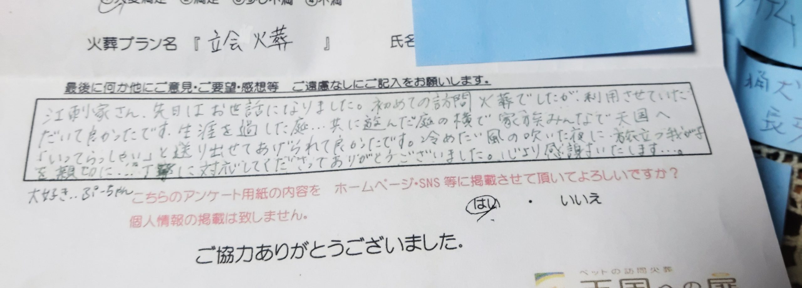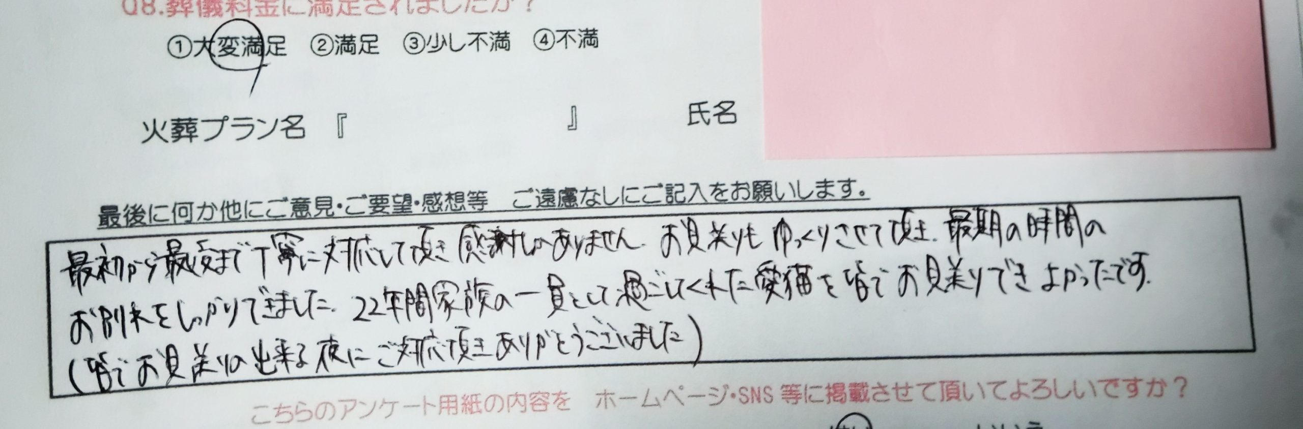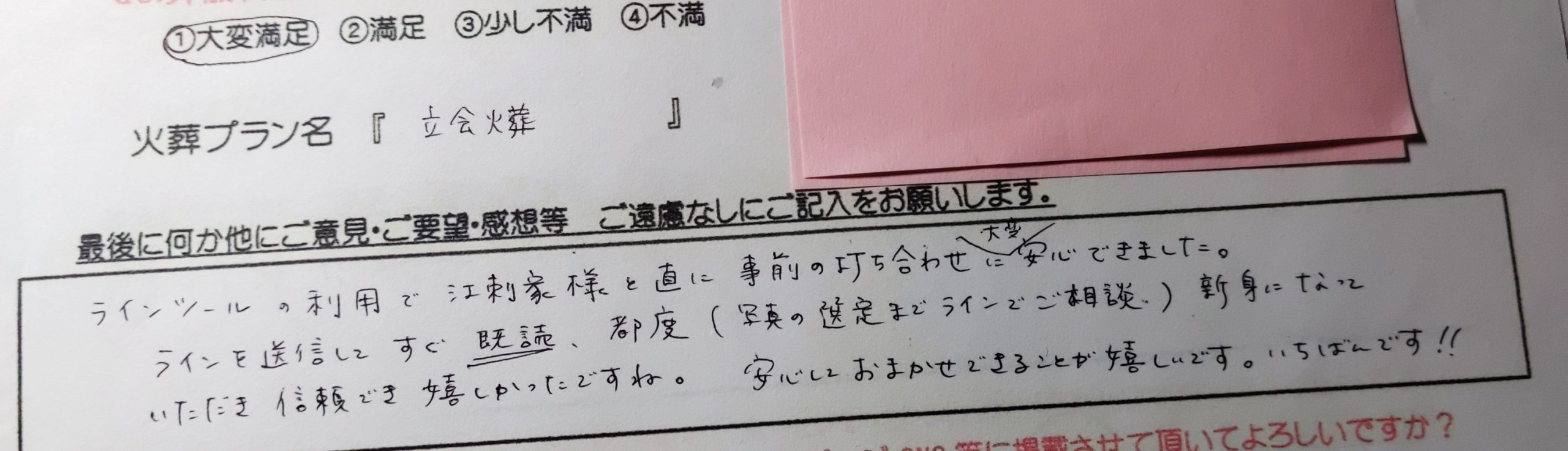 LINEでのやりとりから、大変丁寧にご対応頂き感謝しております。 自宅にてゆっくりと見送る事が出来てとても満足しております。 ありがとうございました。