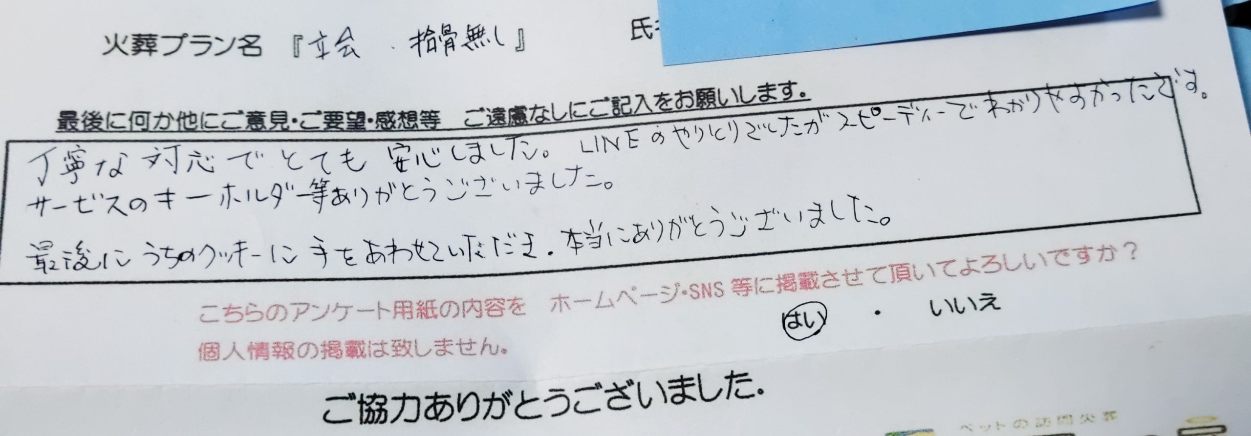 丁寧な対応でとても安心しました。LINEのやりとりでしたがスピーディでわかりやすかったです。 サービスのキーホルダー等ありがとうございました。 最後にうちのクッキーに手をあわせていただき、本当にありがとうございました。