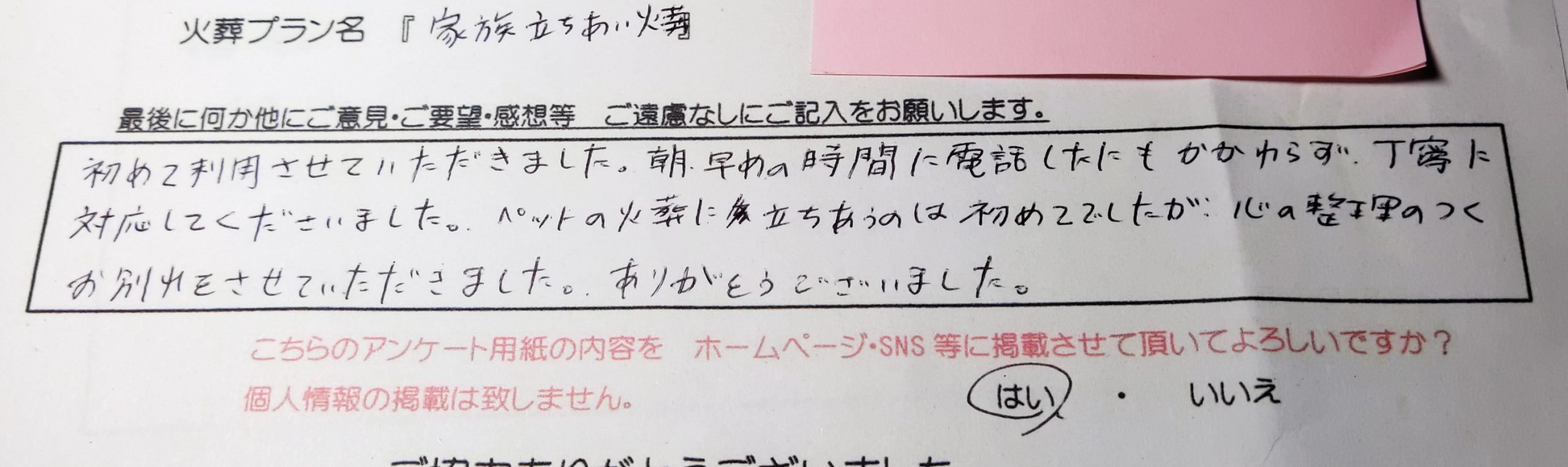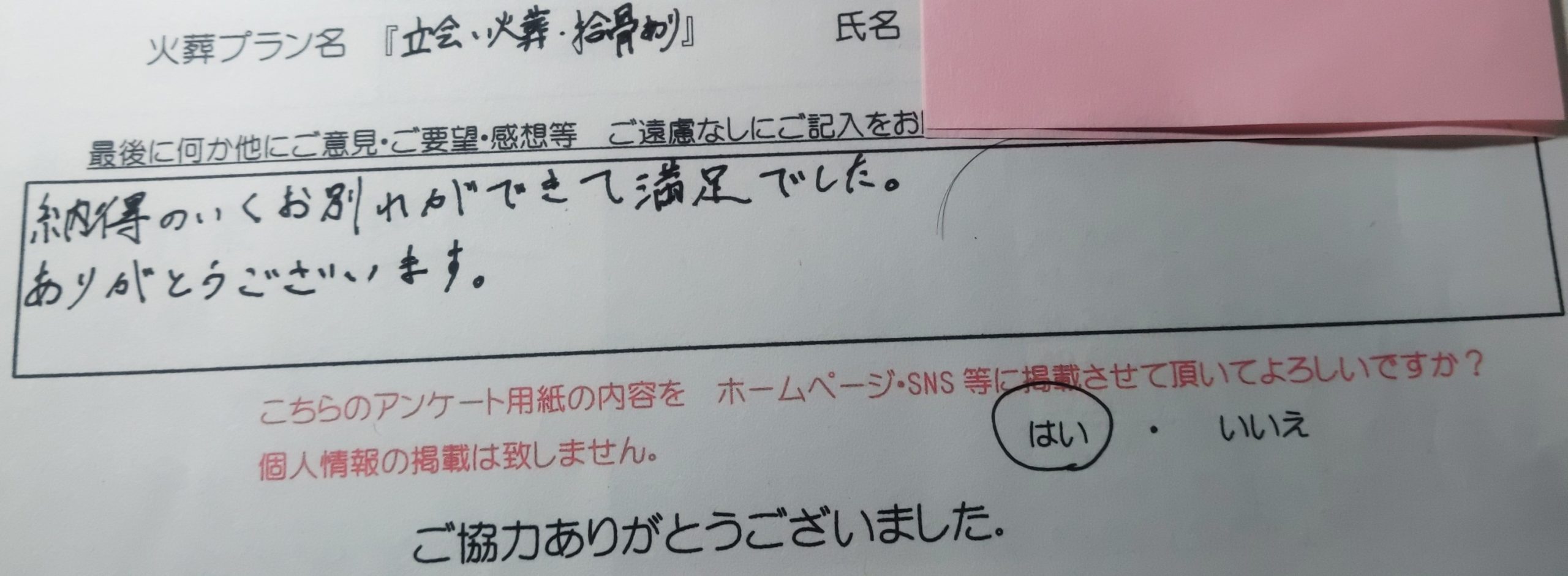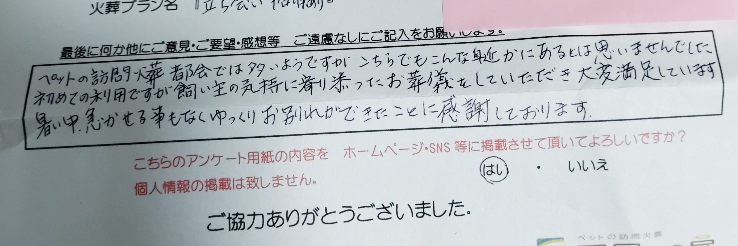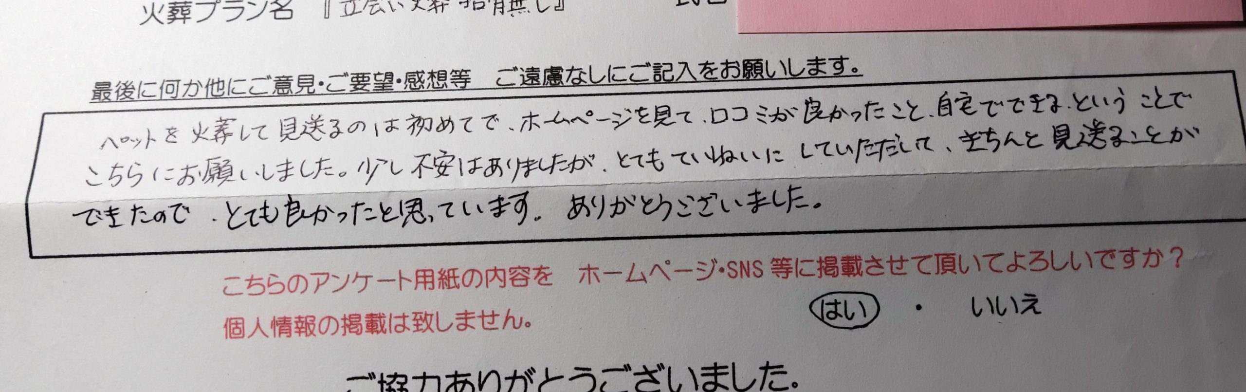 納得のいくお別れができて満足でした。 ありがとうございます。