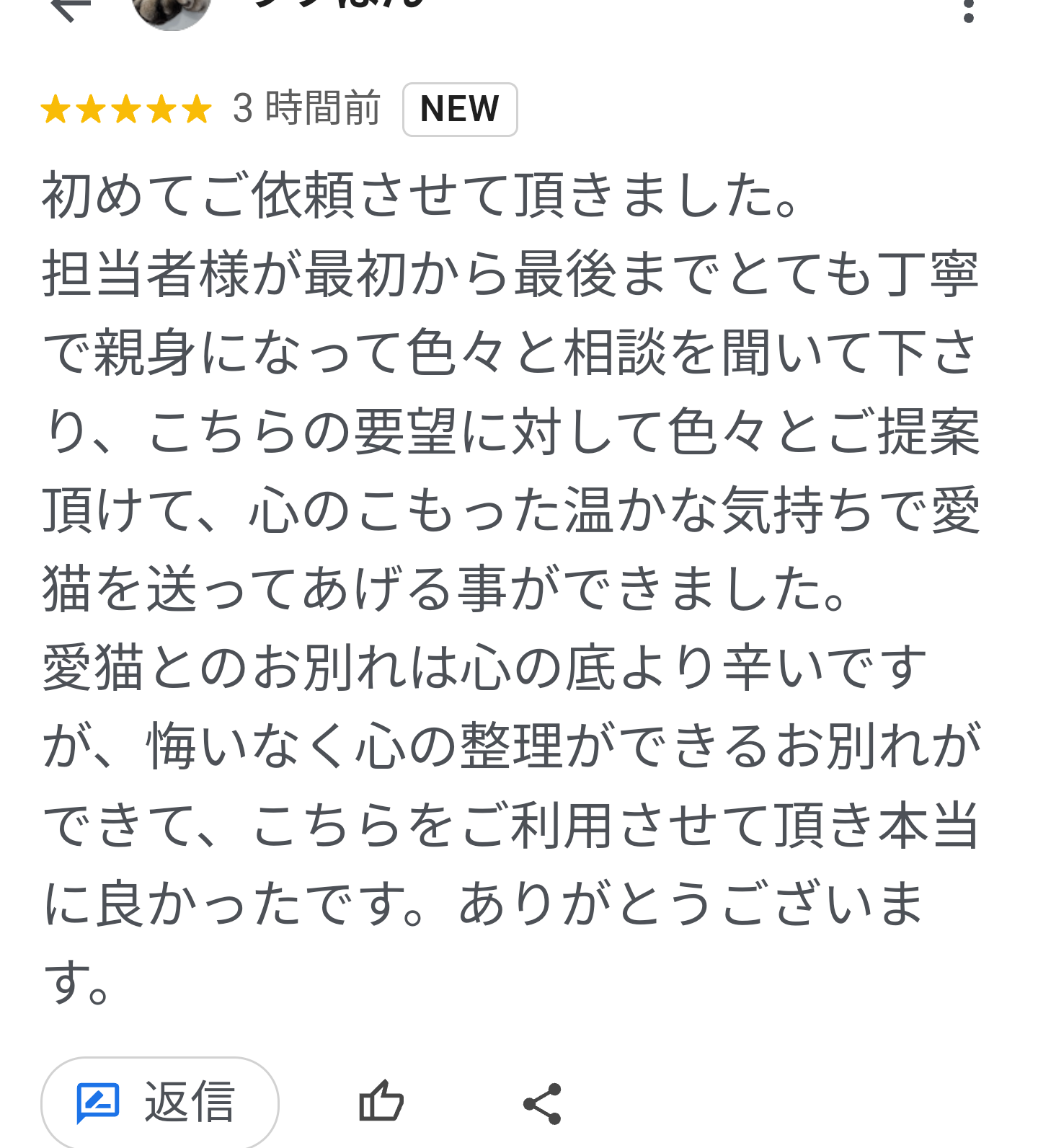 初めてご依頼させて頂きました。 担当者様が最初から最後までとても丁寧で親身になって色々と相談を聞いて下さり、こちらの要望に対して色々と ご提案頂けて、心のこもった温かな気持ちで愛猫を送ってあげる事ができました。 愛猫とのお別れは心の底より辛いですが、悔いなく心の整理ができるお別れができて、こちらをご利用させて頂き本当に良かったです。 ありがとうございます。