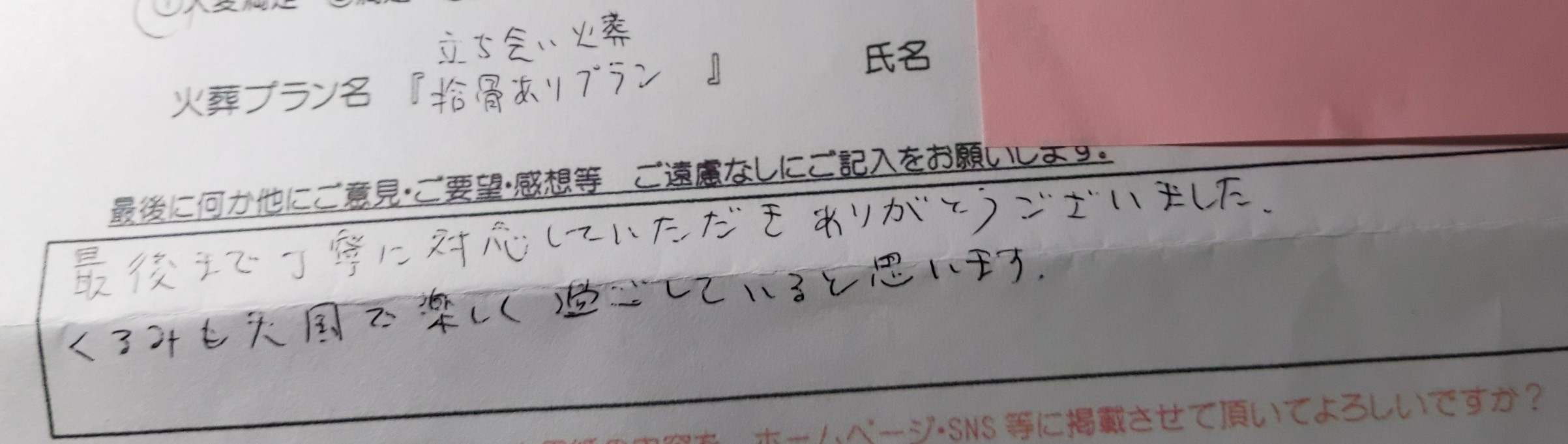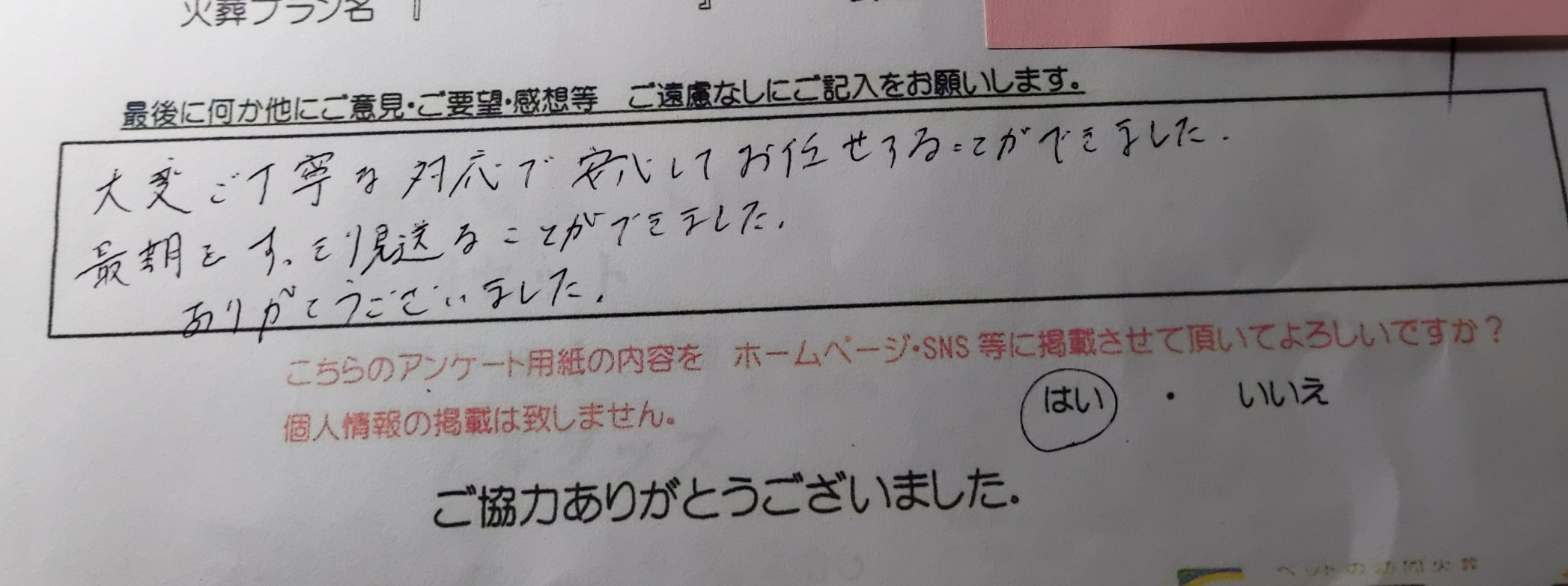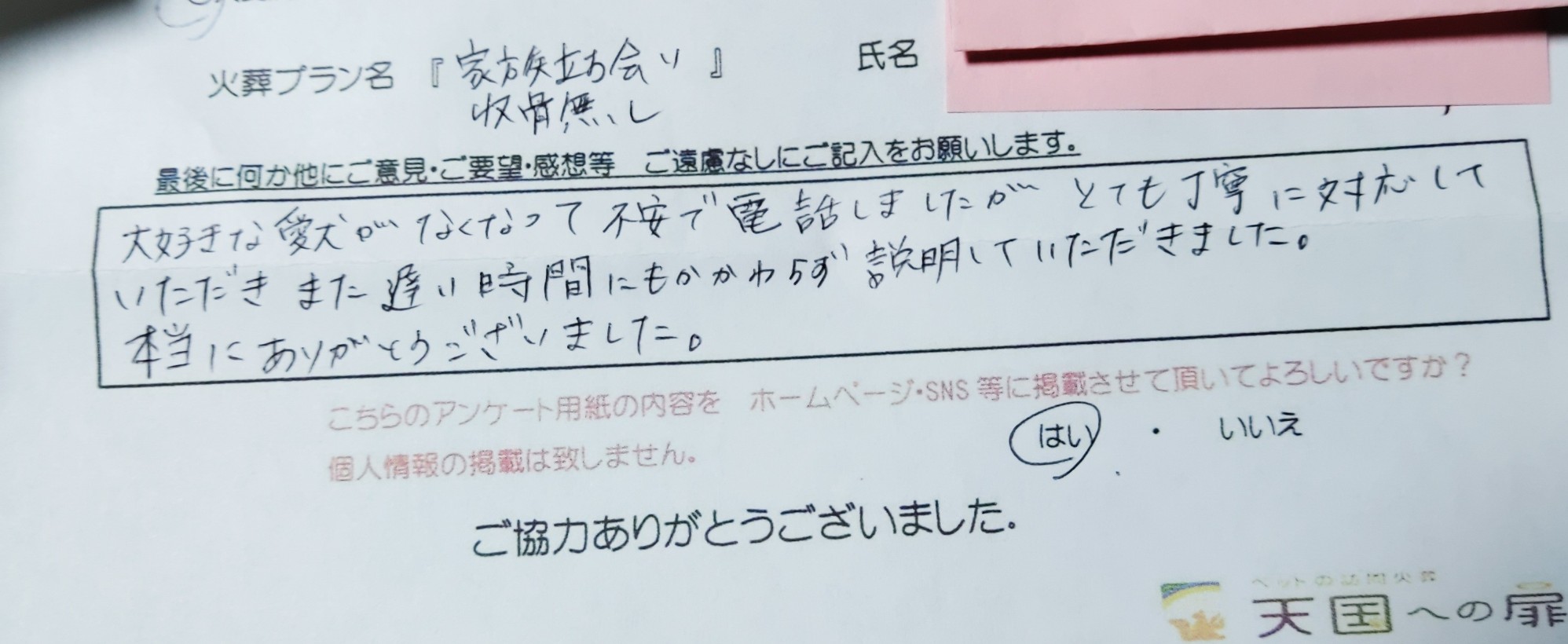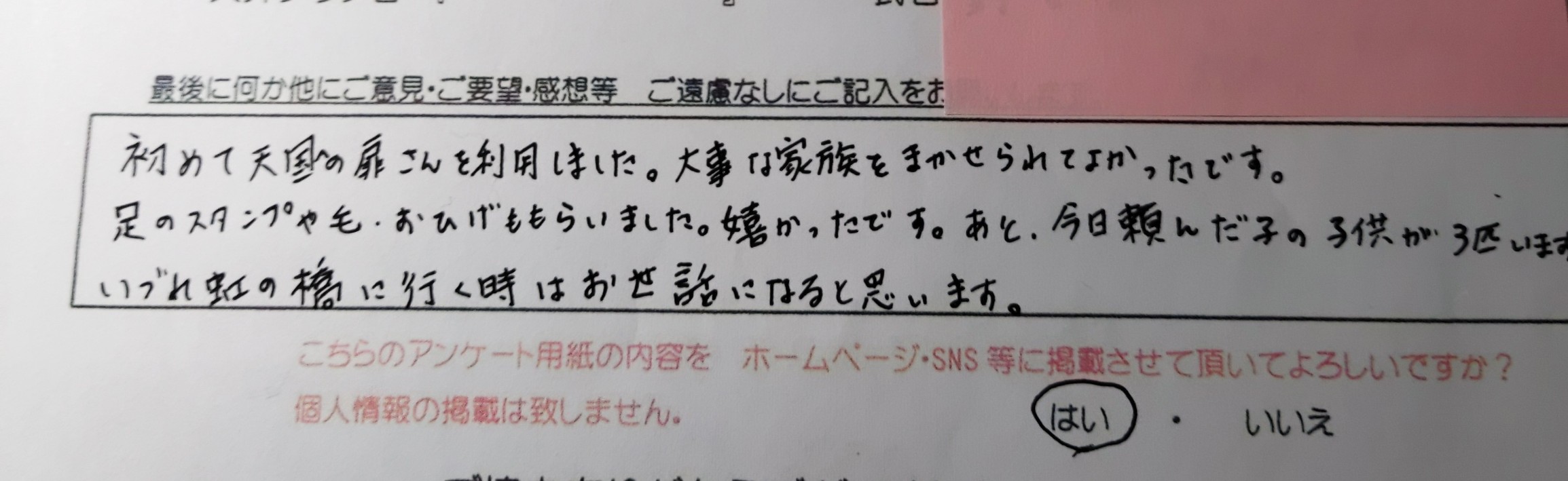 大変ていねいに対応していただき、本当に感謝しています。 旅立つ為の準備も人と同じようにして下さり、ありがとうございました。