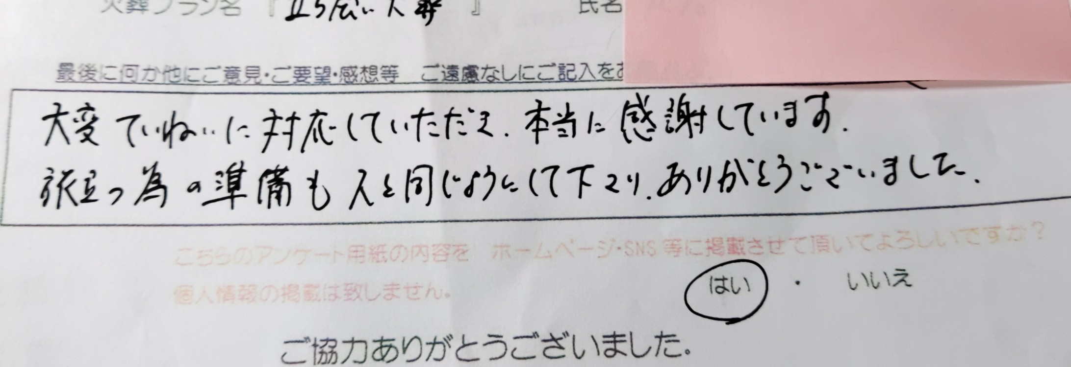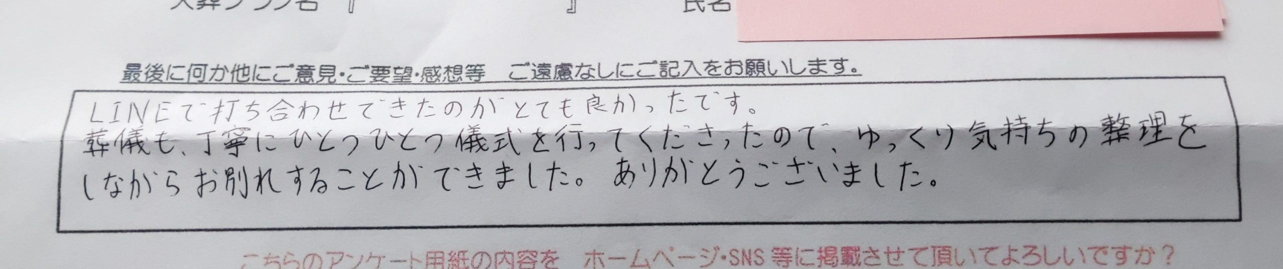 LINEで打ち合わせできたのがとても良かったです。 葬儀も、丁寧にひとつひとつ儀式を行ってくださったので、ゆっくり気持ちの整理をしながらお別れすることができました。 ありがとうございました。