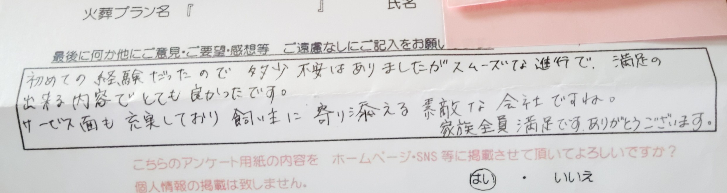初めての経験だったので 多少不安はありましたがスムーズな進行で、満足出来る内容でとても良かったです。 サービス面も充実しており 飼い主に寄り添える 素敵な会社ですね。 家族全員満足です ありがとうございます。