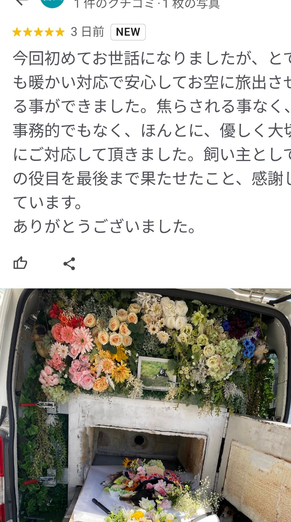 今回初めてお世話になりましたが、とても暖かい対応で安心してお空に旅出せることができました。焦らされる事なく、事務的でもなく、ほんとに、優しく大切にご対応して頂きました。 飼い主としての役目を最後まで果たせたこと、感謝しています。 ありがとうございました。
