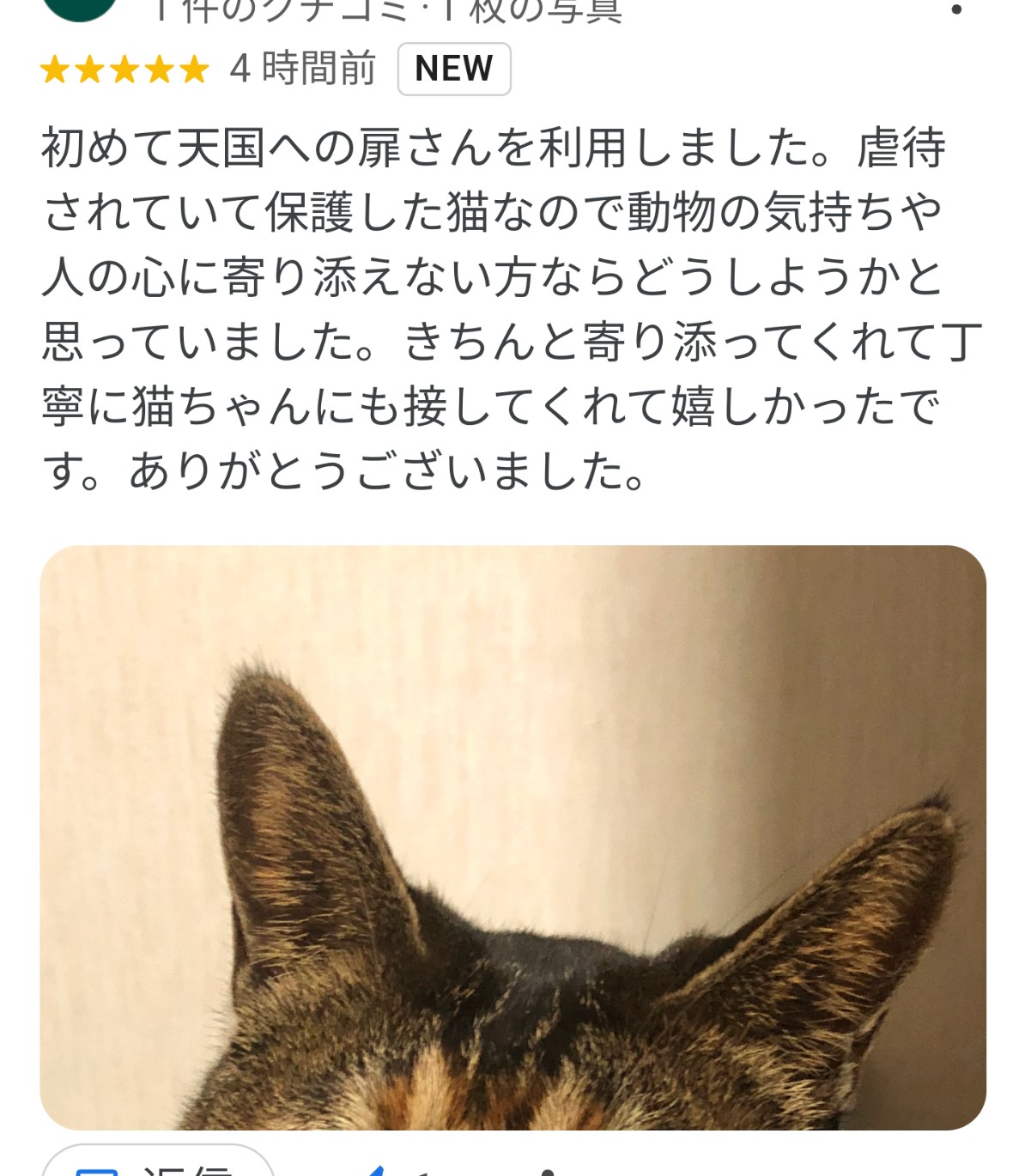 初めて天国への扉さんを利用しました。虐待されていて保護した猫なので動物の気持ちや人の心に寄り添えない方ならどうしようかと思っていました。 きちんと寄り添ってくれて丁寧に猫ちゃんにも接してくれて嬉しかったです。 ありがとうございました。