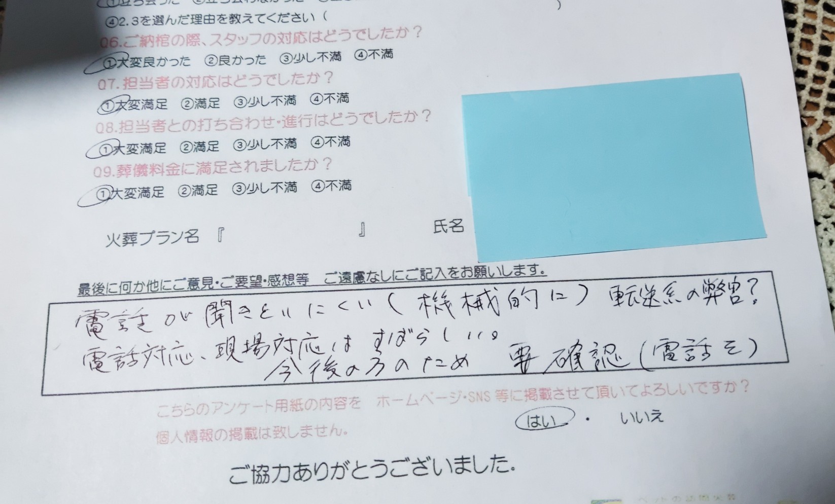電話が聞きとりにくい(機械的に)転送系の弊害? 電話対応、現場対応はすばらしい。 今後の方のため 要確認(電話を)