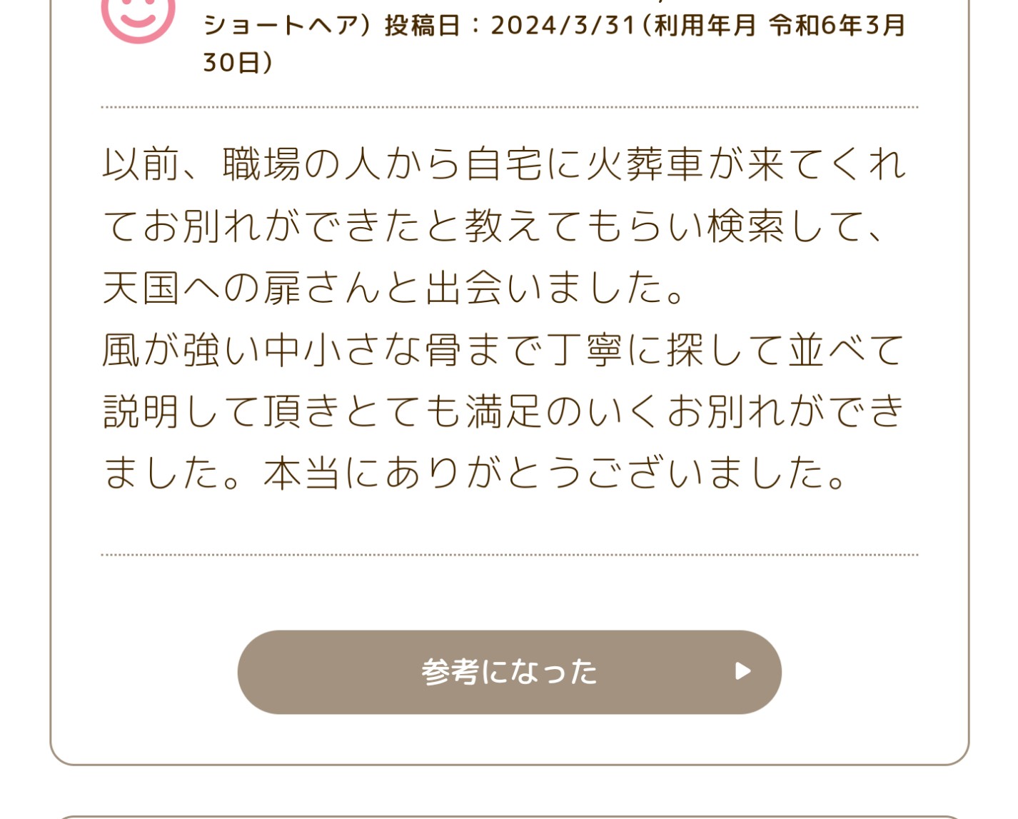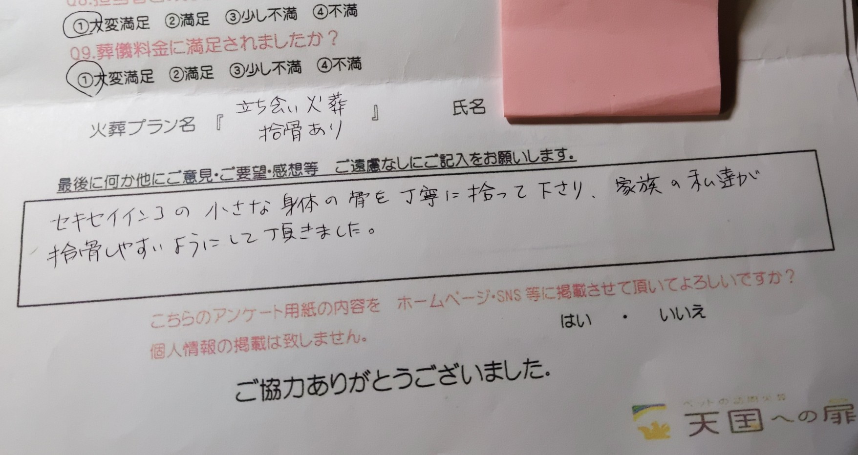 以前、職場の人から自宅に火葬車が来てくれてお別れができたと教えてもらい検索して、天国への扉さんと出会いました。 風が強い中 小さな骨まで丁寧に探して並べて説明して頂き、とても満足のいくお別れができました。本当にありがとうございました。