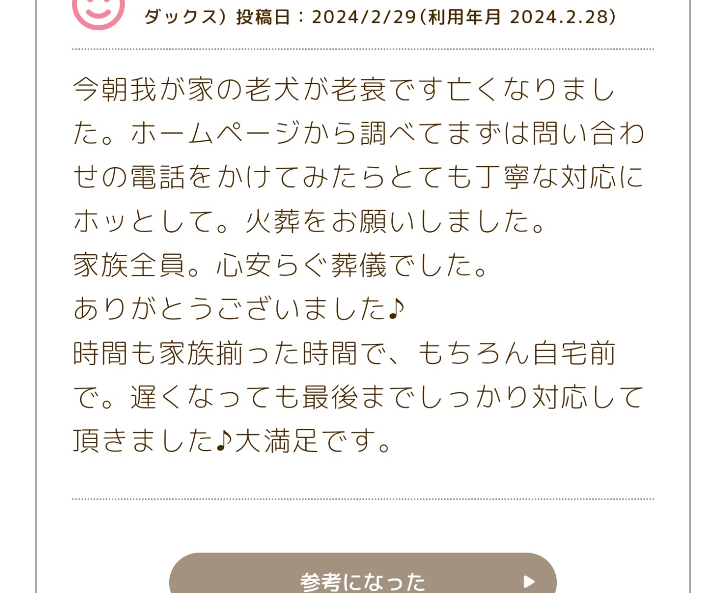 今朝我が家の老犬が老衰で亡くなりました。ホームページから調べてまずは問い合わせの電話をかけてみたら とても丁寧な対応にホッとして。火葬をお願いしました。 家族全員 心安らぐ葬儀でした。 ありがとうございました♪ 時間も家族揃った時間で、もちろん自宅前で。遅くなっても最後までしっかり対応して頂きました♪ 大満足です。