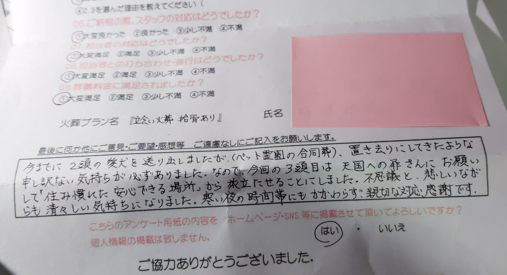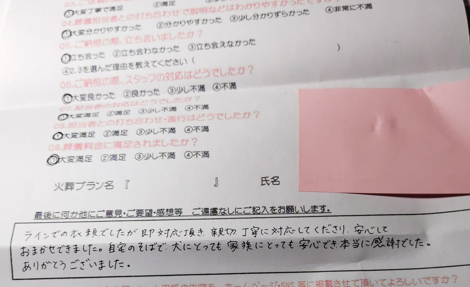 ラインでの依頼でしたが即対応して頂き、親切丁寧に対応してくださり、安心しておまかせできました。 自宅のそばで、犬にとっても家族にとっても安心でき 本当に感謝でした。ありがとうございました。