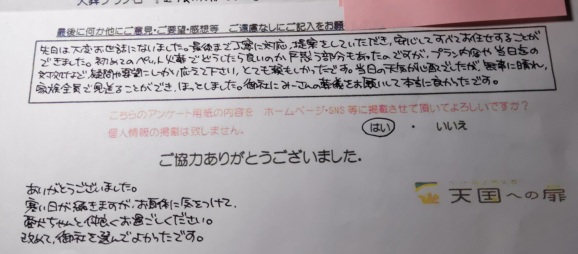先日は大変お世話になりました。最後まで丁寧に対応、提案していただき、安心してすべてお任せすることができました。 初めてのペット火葬でどうしたら良いのか戸惑う部分もあったのですが、プラン内容や当日迄の対処など疑問や要望にしっかり応えて下さり、とても頼もしかったです。 当日の天気が心配でしたが、無事に晴れ、家族全員で見送ることができ、ほっとしました。 御社にみーさんの葬儀をお願いして本当に良かったです。 ありがとうございました。 寒い日が続きますが、お身体に気をつけて、愛犬ちゃんと仲良くお過ごしください。 改めて、御社を選んでよかったです。