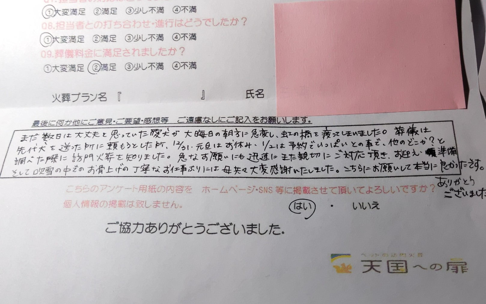 まだ数日は大丈夫と思っていた愛犬が大晦日の朝方に急変し、虹の橋を渡ってしまいました。 葬儀は先代犬を送った所に頼もうとした所、12月31日・元旦はお休み 1月2日は予約でいっぱいとの事で、他のどこか?と調べた際に訪問火葬を知りました。 急なお願いにも迅速にまた親切にご対応頂き、お迎え準備 そして吹雪の中でのお骨上げの丁寧なお仕事ぶりには 母共々大変感謝いたしました。こちらにお願いして本当に良かったです。ありがとうございました。