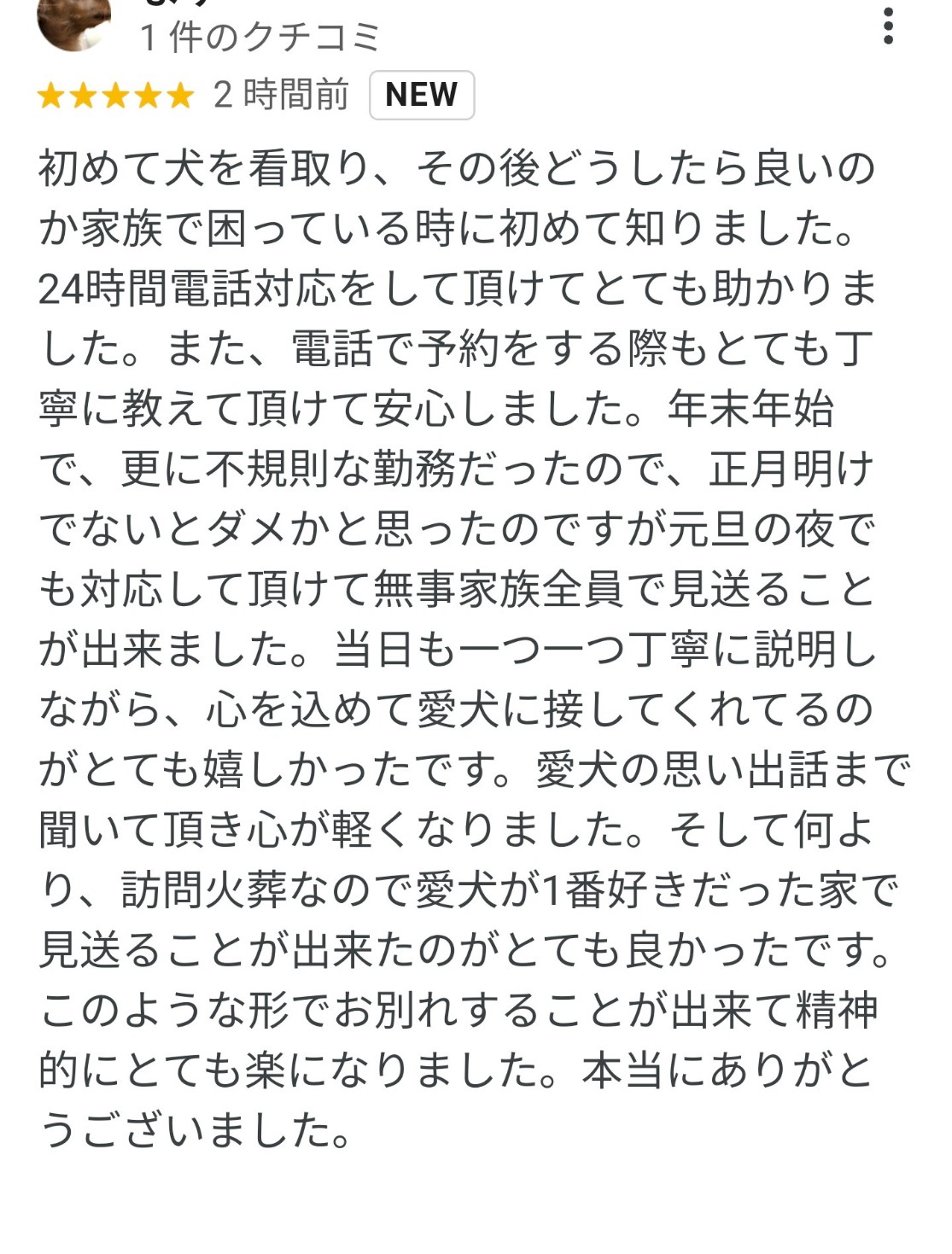 初めて犬を看取り、その後どうしたら良いのか家族で困っている時に初めて知りました。 24時間電話対応をして頂けとても助かりました。 また電話で予約をする際もとても丁寧に教えて頂けて安心しました。 年末年始で、更に不規則な勤務だったので、正月明けでないとダメかと思ったのですが、元旦の夜でも対応して頂けて無事家族全員で見送ることが出来ました。 当日も一つ一つ丁寧に説明しながら、心を込めて愛犬に接してくれてるのがとても嬉しかったです。 愛犬の思い出話まで聞いて頂き心が軽くなりました。 そして何より、訪問火葬なので愛犬が1番好きだった家で見送ることが出来たのがとても良かったです。 このような形でお別れすることが出来て精神的にとても楽になりました。 本当にありがとうございました。