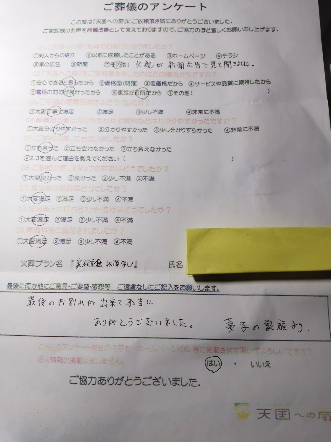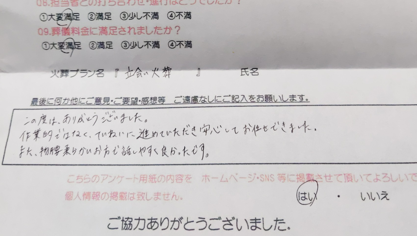 最後のお別れを親切丁寧に対応して頂きありがとうございました。 家族一同安心して見送りすることができました。 ありがとうございました。