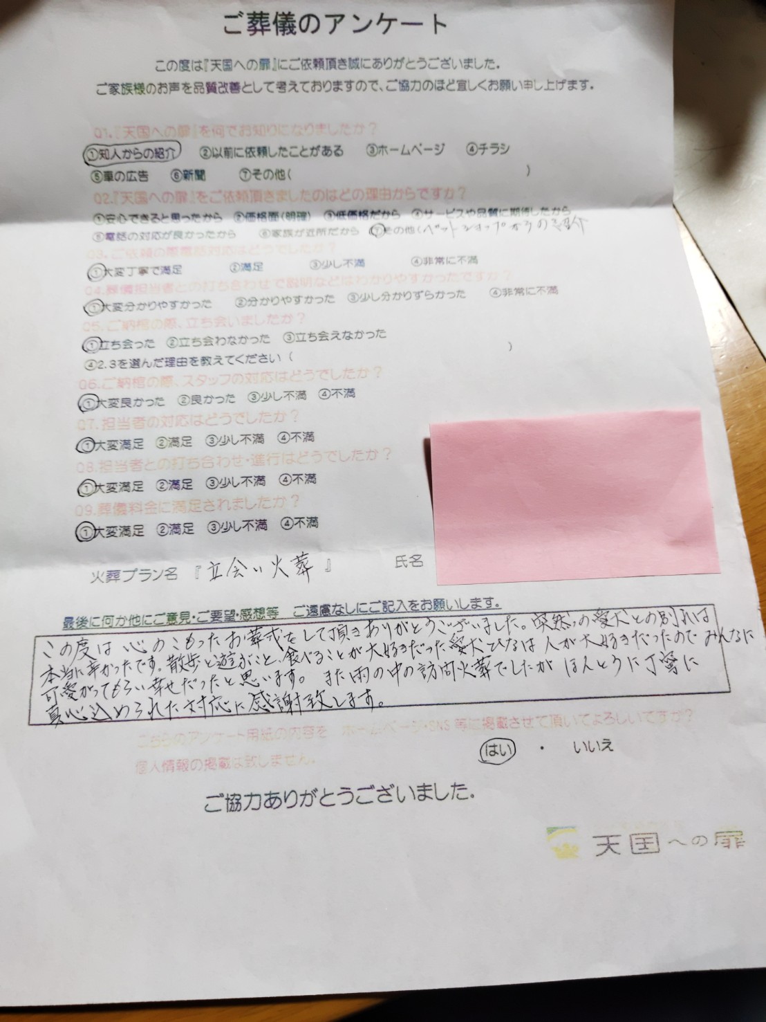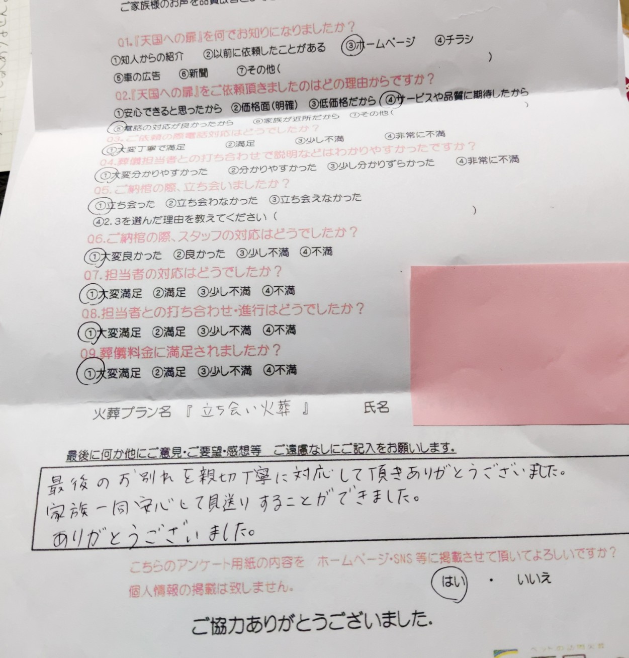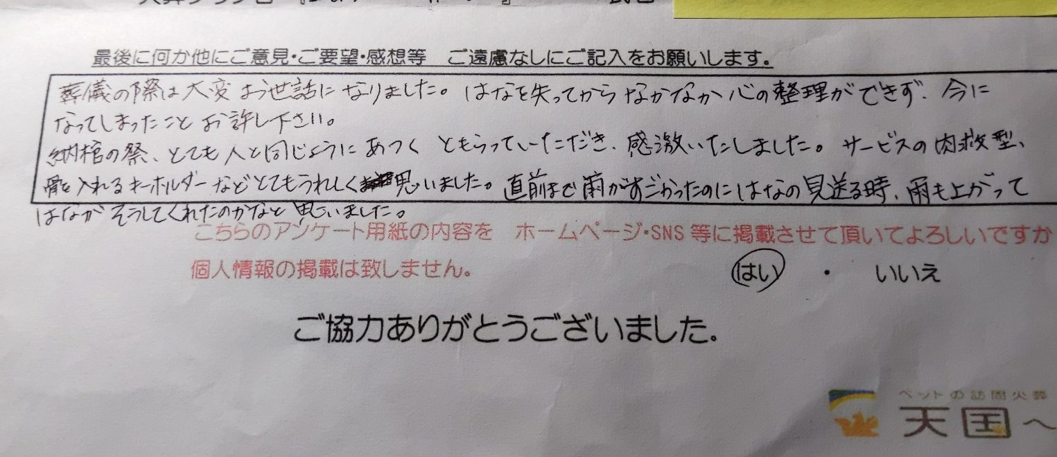 葬儀の際は大変お世話になりました。はなを失ってからなかなか心の整理ができず、今になってしまったことお許し下さい。 納棺の際、とても人と同じようにあつく ともらっていただき、感激いたしました。サービスの肉球型、骨を入れるキーホリダーなどとてもうれしく思いました。 直前まで雨がすごかったのに はなの見送るとき、雨が上がって はながそうしてくれたのかなと思いました。