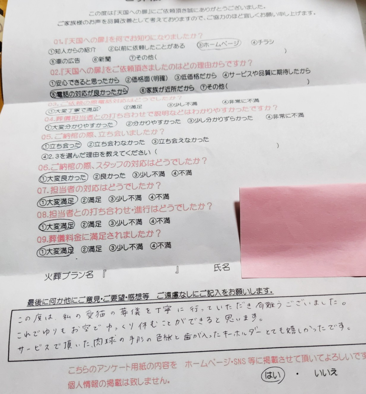 この度は、私の愛猫の葬儀を丁寧に行っていただき有難うございました。 これで ゆりもお空でゆっくり休むことができると思います。 サービスで頂いた、肉球の手形の色紙と歯が入ったキーホルダーとても嬉しかったです。