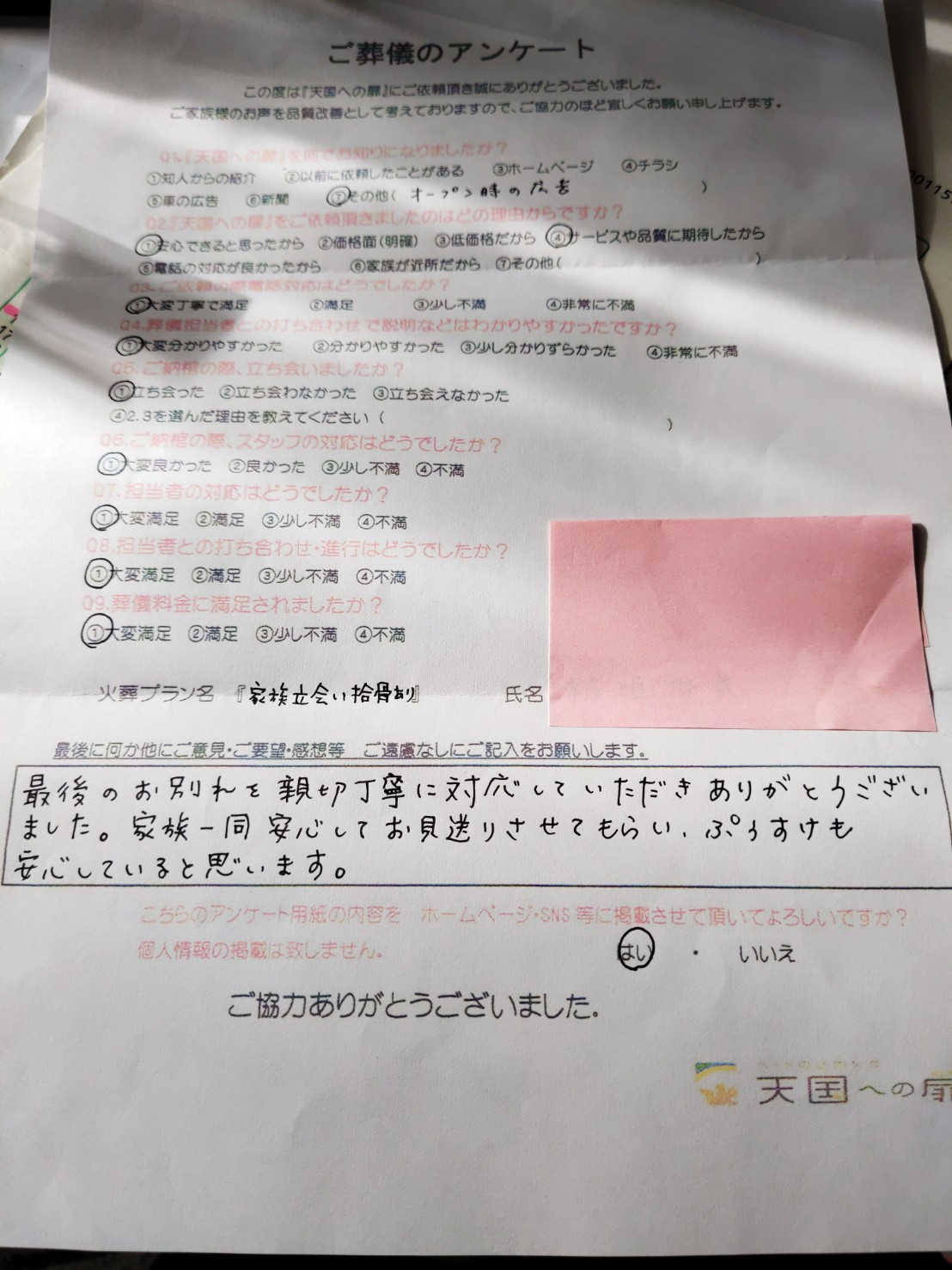 最後のお別れを親切丁寧に対応して頂きありがとうございました。 家族一同安心してお見送りさせてもらい、ぷぅすけも安心していると思います。