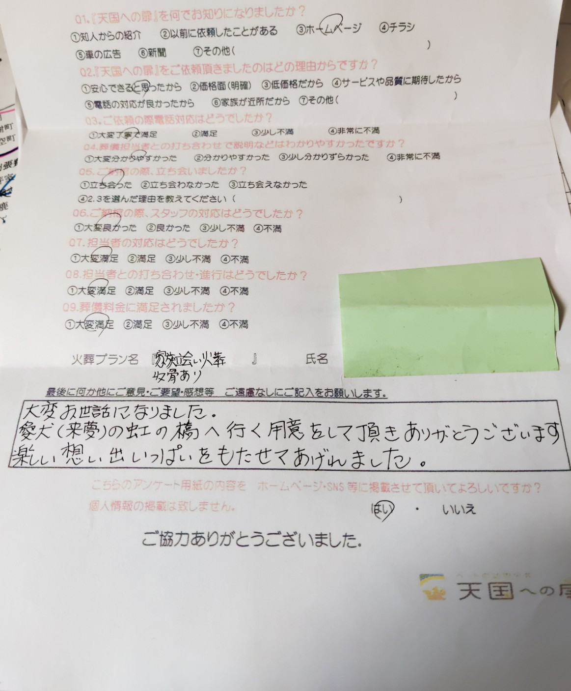 大変お世話になりました。 愛犬(来夢)の虹の橋へ行く用意をして頂きありがとうございます。 楽しい想い出いっぱいをもたせてあげれました。