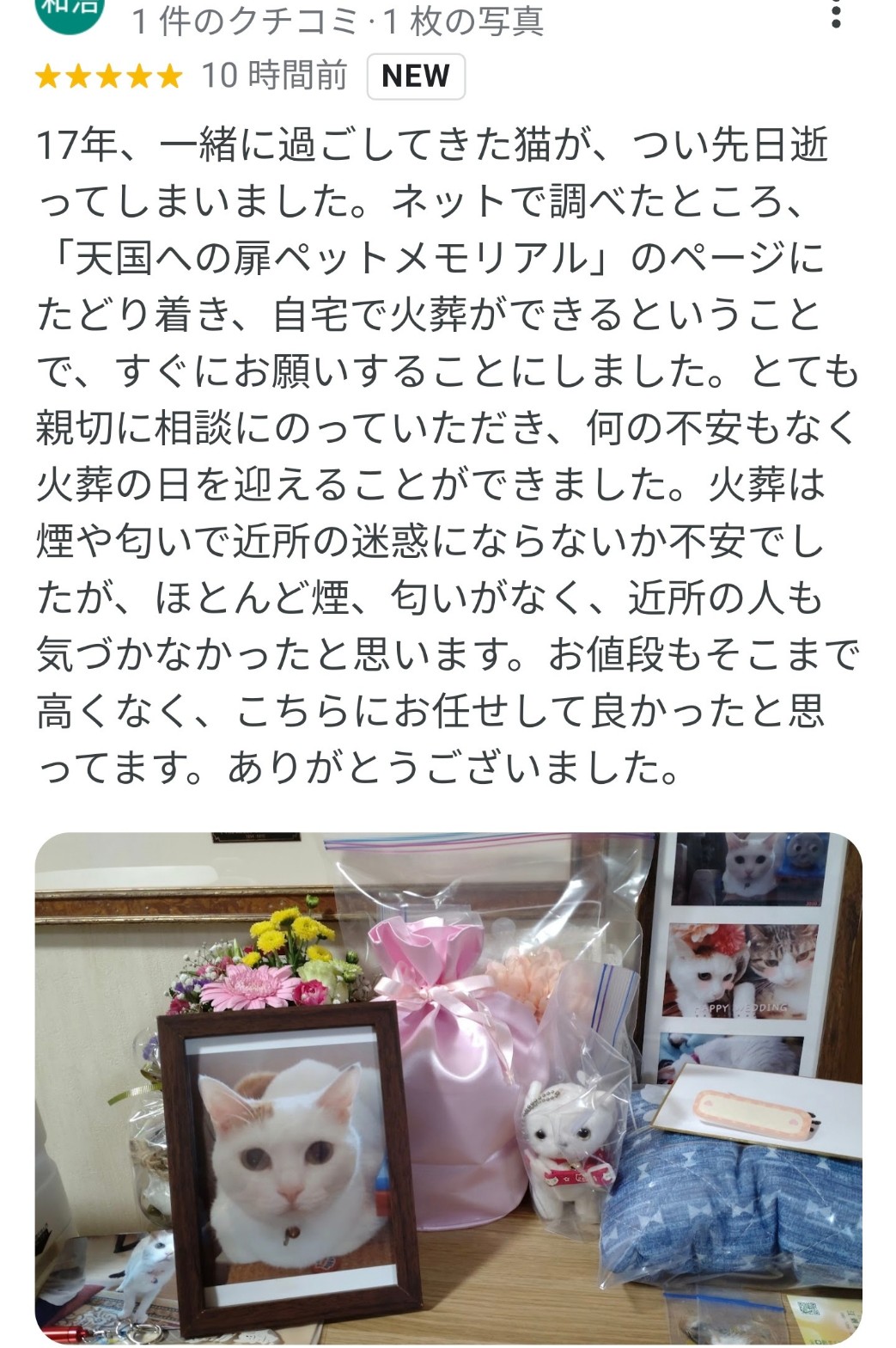 17年、一緒に過ごしてきた猫が、つい先日逝ってしまいました。 ネットで調べたところ、「天国への扉ペットメモリアル」 のページにたどり着き、自宅で火葬できるということで、すぐにお願いすることにしました。 とても親切に相談にのっていただき、何の不安もなく火葬の日を迎えることができました。 火葬は煙や匂いで近所の迷惑にならないか不安でしたが、ほとんど煙、匂いがなく、近所の人も気づかなかったと思います。 お値段もそこまで高くなく、こちらにお任せして良かったと思っています。 ありがとうございました。
