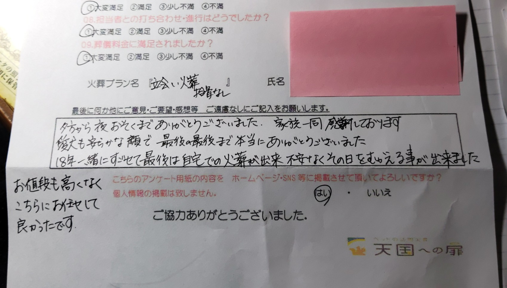 夕方から夜おそくまでありがとうございました。 家族一同感謝しております。 愛犬も安らかな顔で最後の最後まで本当にありがとうございました。 18年一緒にすごせて最後は自宅での火葬が出来 不安なくその日をむかえる事が出来ました。 お値段も高くなく こちらにお任せして良かったです。