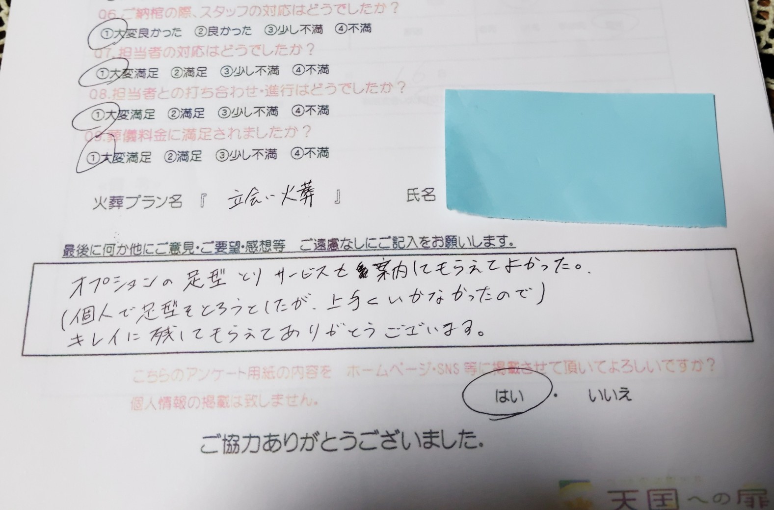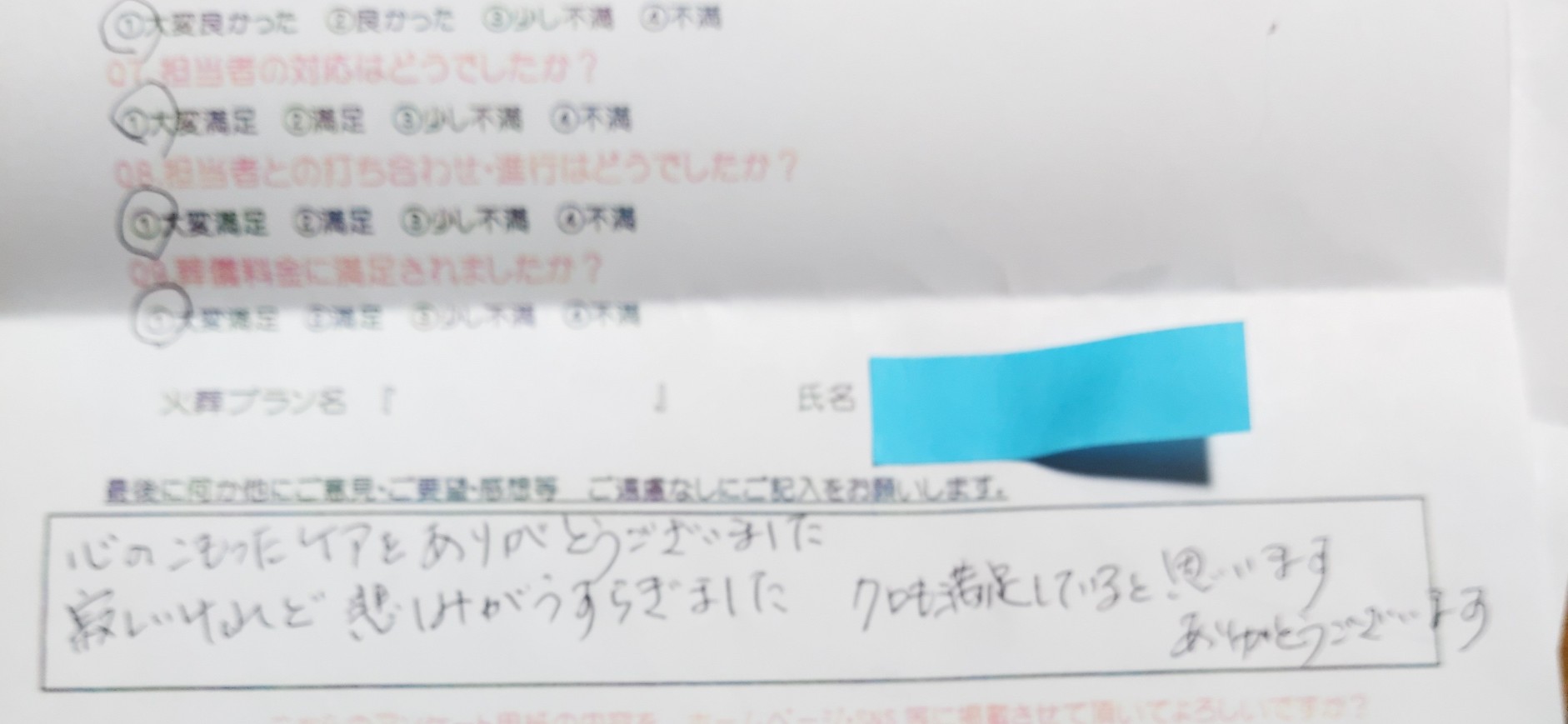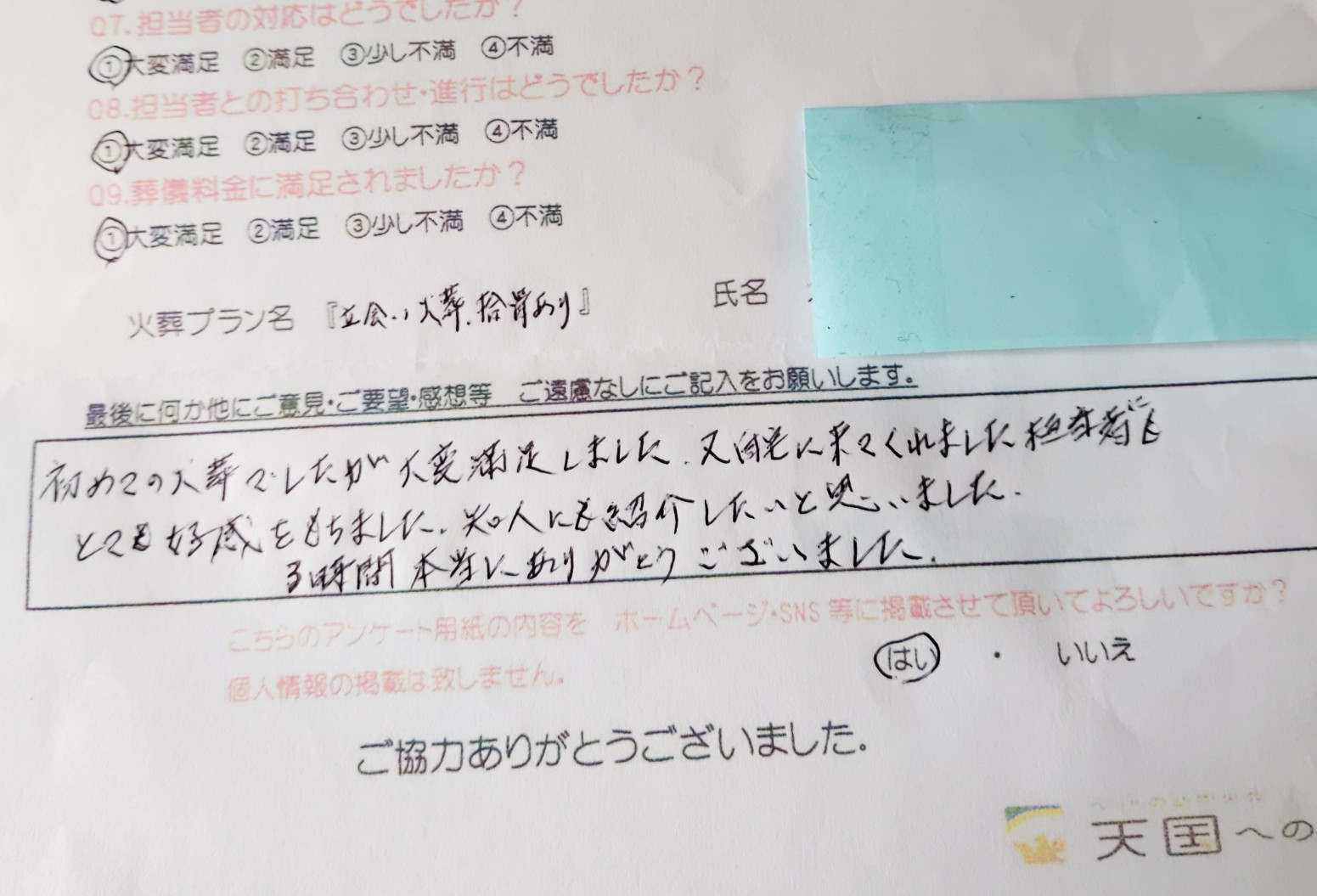 初めての火葬でしたが大変満足しました。 又 自宅に来てくれました担当者にもとても好感をもちました。 知人にも紹介したいと思いました。 3時間本当にありがとうございました。