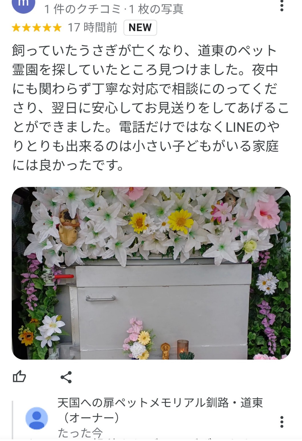 飼っていたうさぎが亡くなり、道東のペット霊園を探していたところ見つけました。 夜中にも関わらず丁寧な対応で相談にのってくださり、翌日に安心してお見送りをしてあげることができました。 電話だけではなくLINEのやりとりも出来るのは小さい子供がいる家庭には良かったです。