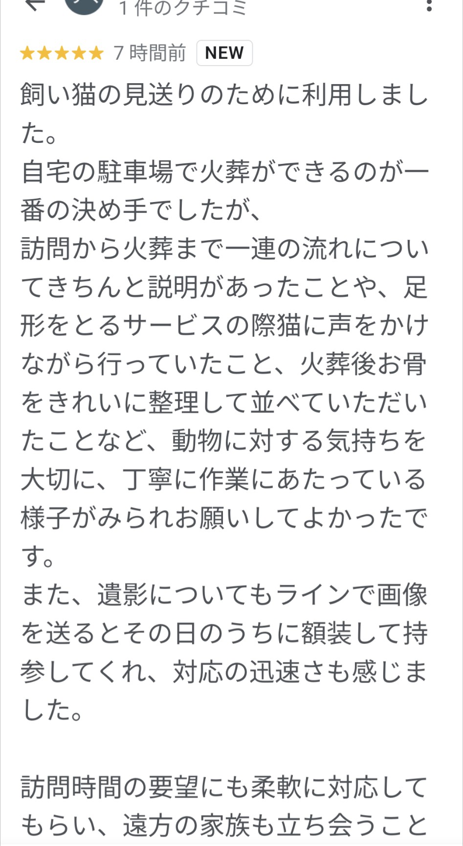 飼い猫の見送りのために利用しました。 自宅の駐車場で火葬できるのが一番の決め手でしたが、訪問から火葬まで一連の流れについてきちんと説明があったことや、足形をとるサービスの際 猫に声をかけながら行っていたこと、火葬後お骨をきれいに整理して並べていただいたことなど、動物に対する気持ちを大切に、丁寧に作業にあたっている様子がみられ お願いしてよかったです。 また、遺影についてもラインで画像を送るとその日のうちに額装して持参してくれ、対応の迅速さも感じました。 訪問時間の要望にも柔軟に対応してもらい、遠方の家族も立ち会うことができ、全員見送ることができました。 ありがとうございました。