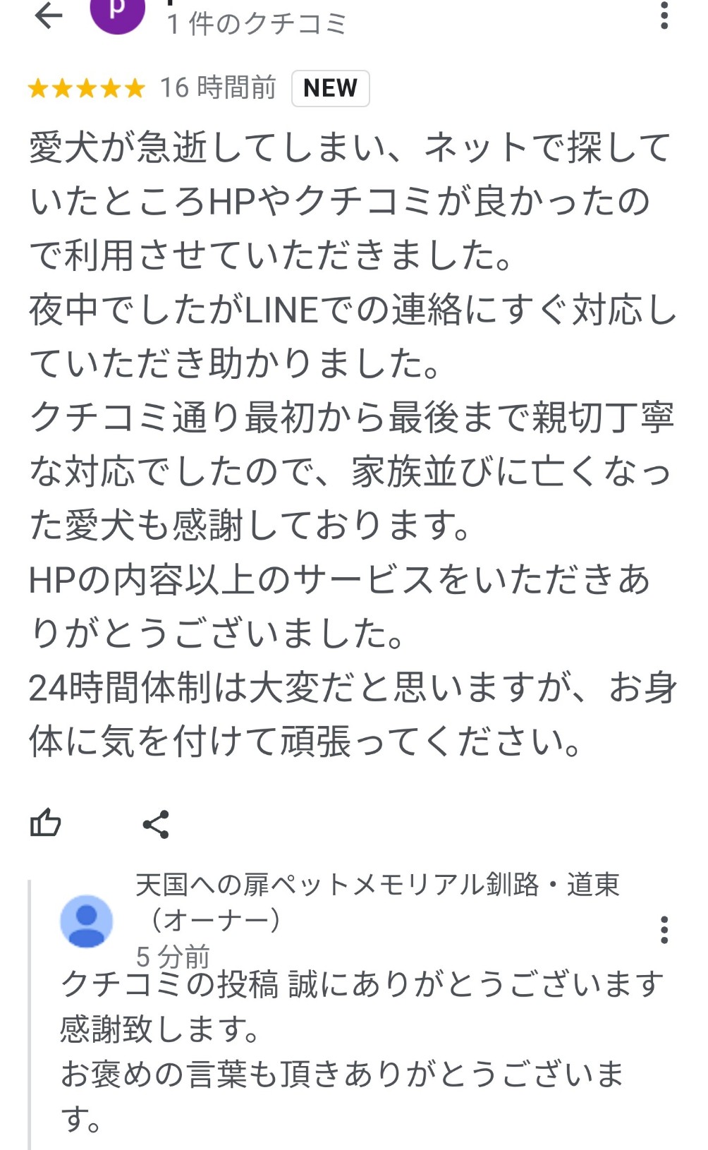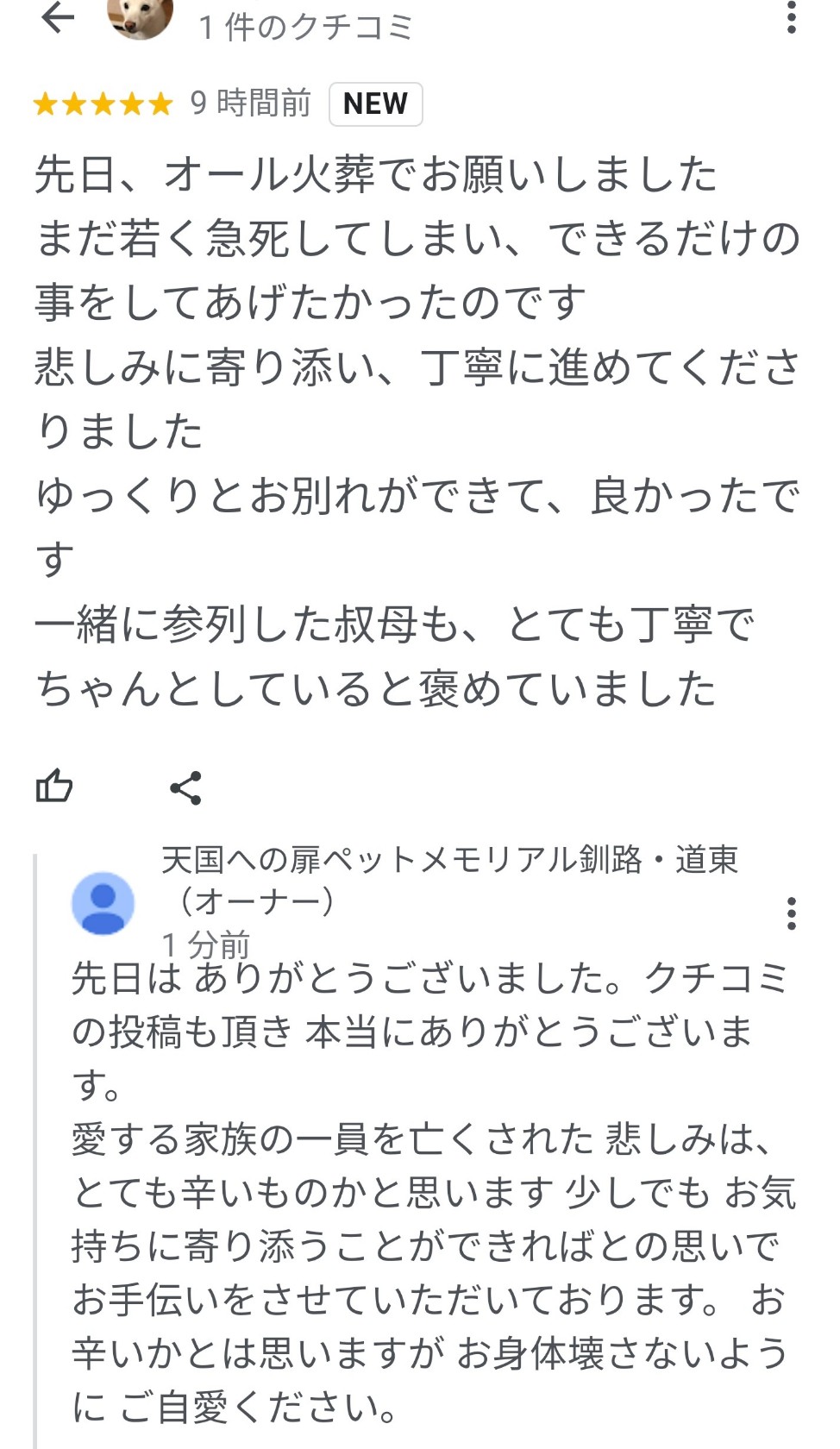 愛犬が急逝してしまい、ネットで探していたところHPやクチコミが良かったので利用させていただきました。 夜中でしたがLINEでの連絡にすぐ対応していただき助かりました。 クチコミ通り最初から最後まで親切丁寧な対応でしたので、家族並びに亡くなった愛犬も感謝しております。 HPの内容以上のサービスをいただきありがとうございました。 24時間体制は大変だと思いますが、お身体に気を付けて頑張ってください。