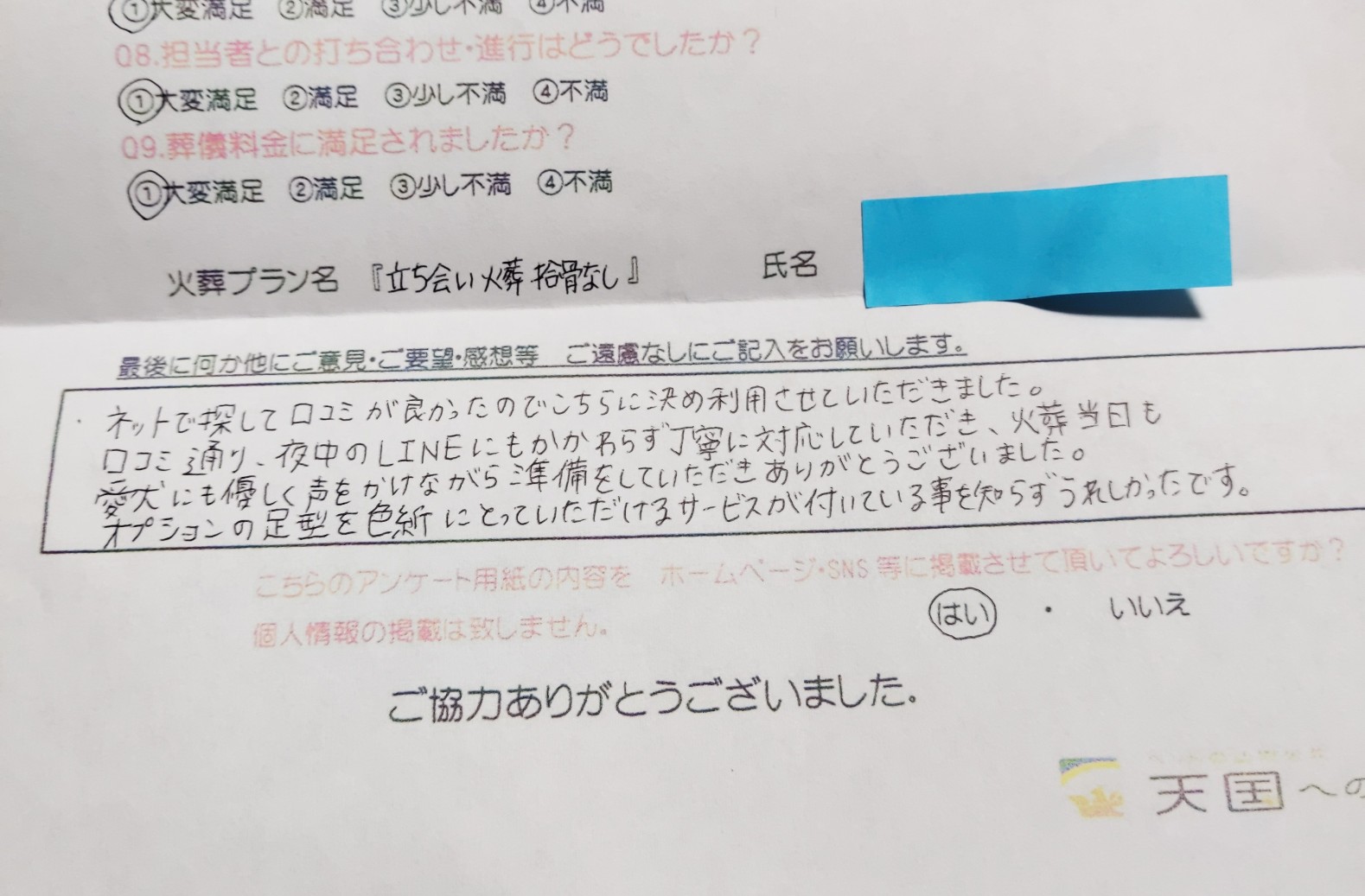 ネットで探して口コミが良かったのでこちらに決め利用させていただきました。 口コミ通り、夜中のLINEにもかかわらず丁寧に対応していただき、火葬当日も愛犬に優しく声をかけながら準備をしていただきありがとうございました。 オプションの足型を色紙にとっていただけるサービスが付いている事を知らずうれしかったです。