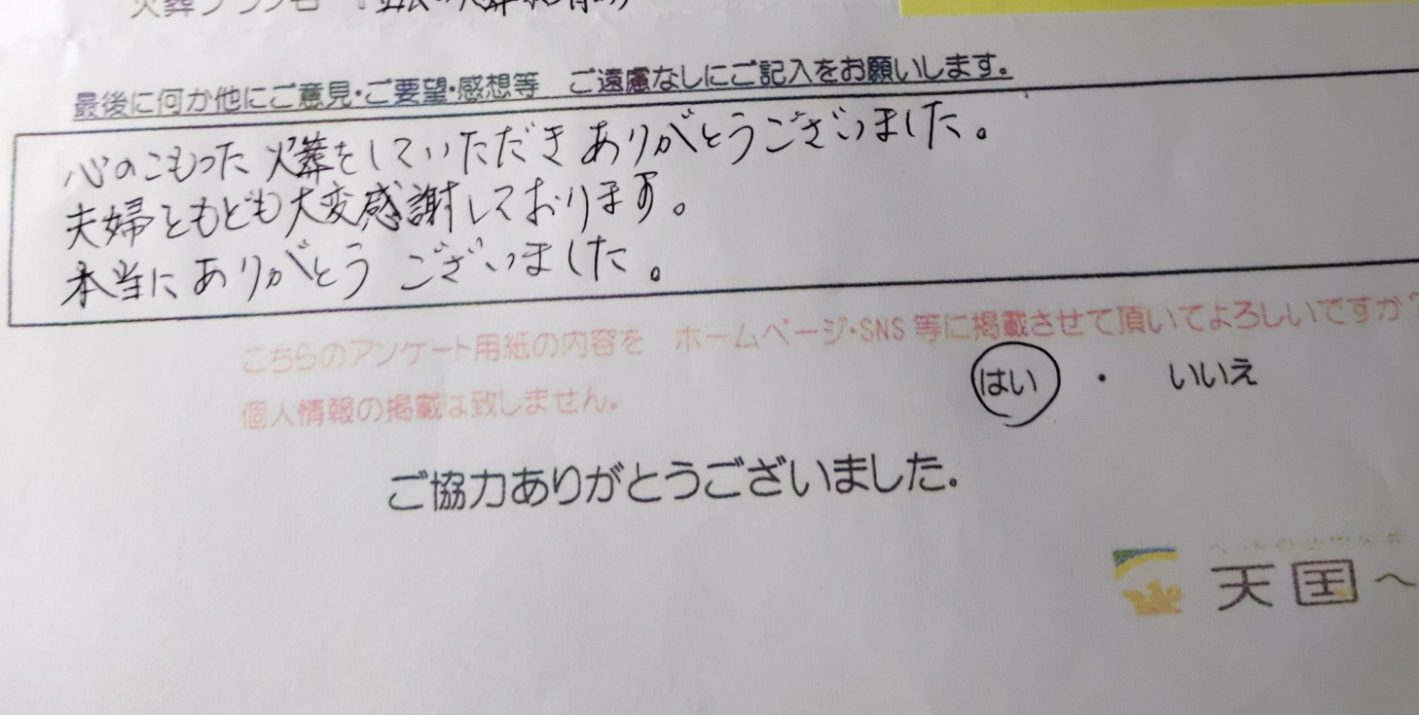 心のこもった火葬をしていただきありがとうございました。 夫婦ともども大変感謝しております。 本当にありがとうございました。