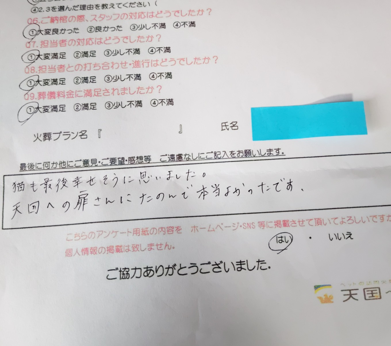 猫も最後幸せそうに思いました。 天国への扉さんにたのんで本当よかったです。