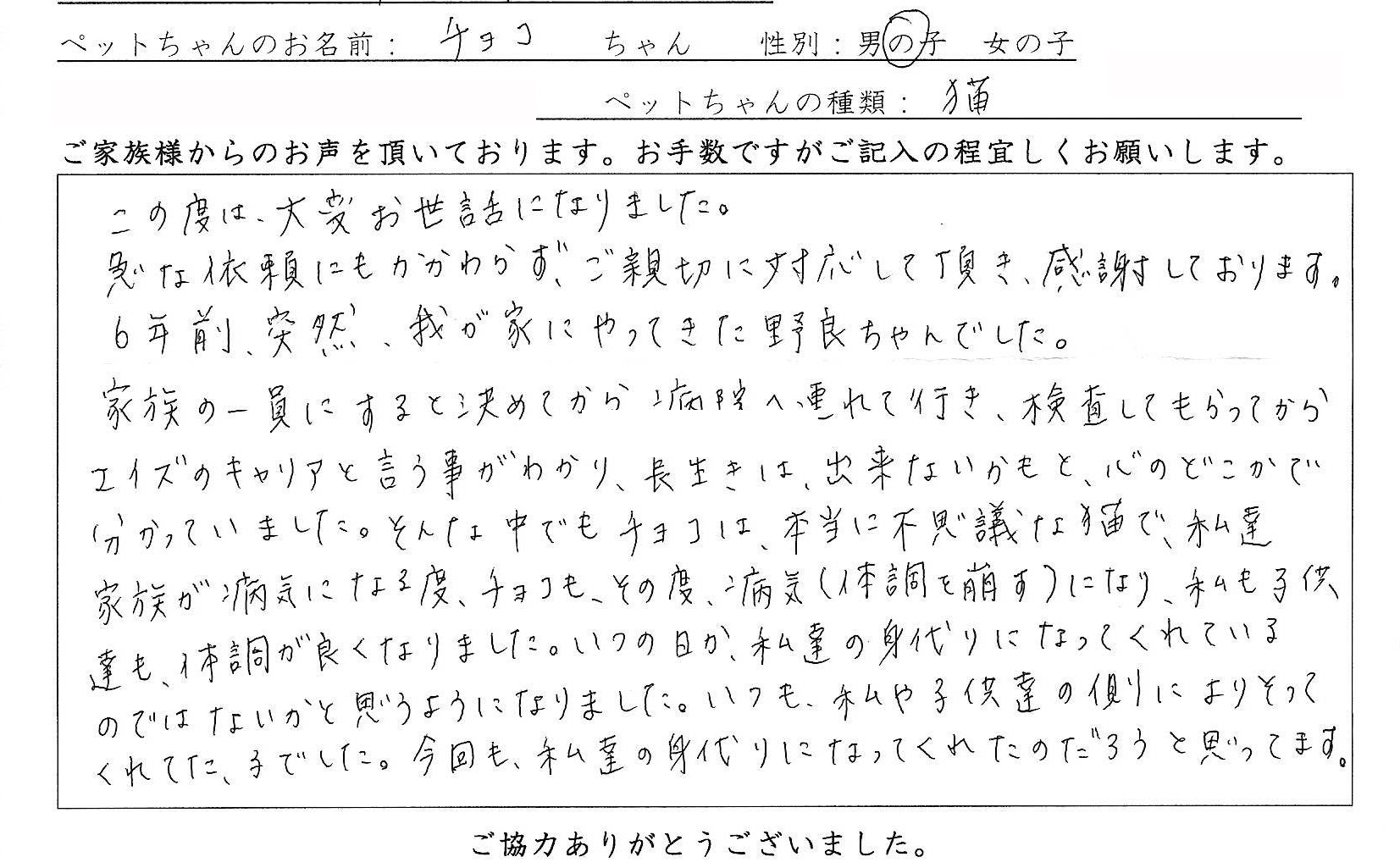この度は大変お世話になりました。急な依頼にもかかわらずご親切に対応して頂き感謝しております。6年前、突然、我が家にやってきた野良ちゃんでした。家族の一員にすると決めてから病院へ連れて行き、検査してもらってからエイズのキャリアと言う事がわかり、長生きはできないかもと、心のどこかで分かっていました。そんな中でもチョコは本当に不思議な猫で私達家族が病気になる度、チョコもその度、病気(体調を崩す)になり、私も子供達も体調が良くなりました。いつの日か、私達の身代わりになってくれるのではないかと思うようになりました。いつも私や子供達の側によりそってくれた子でした。今回も私達の身代わりになってくれたのだろうと思ってます。