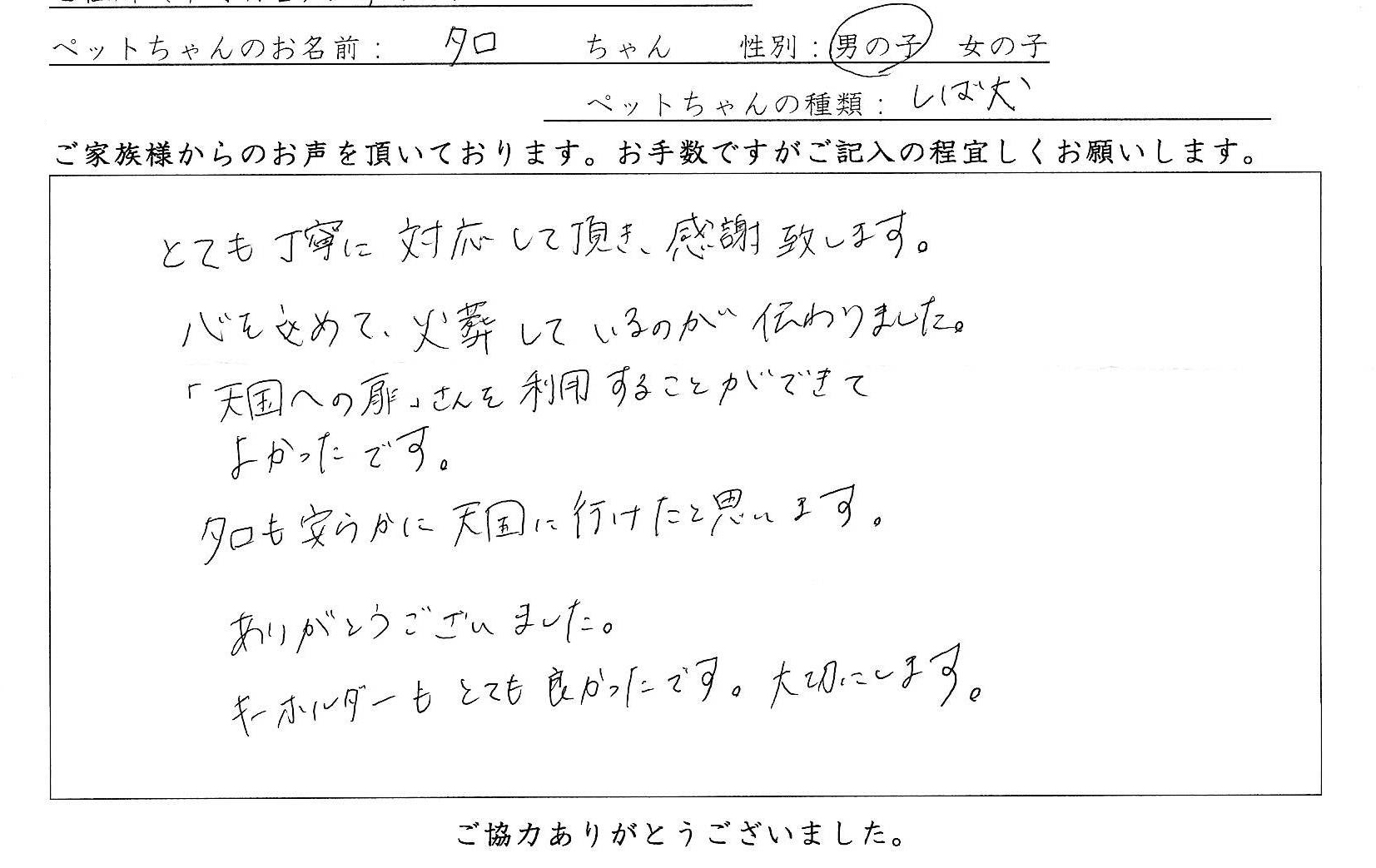 とても丁寧に対応して頂き、感謝致します。心を込めて、火葬してるのが伝わりました。「天国への扉」さんを利用することができてよかったです。タロも安らかに天国に行けたと思います。ありがとうございました。キーホルダーもとてもよかったです。大切にします。