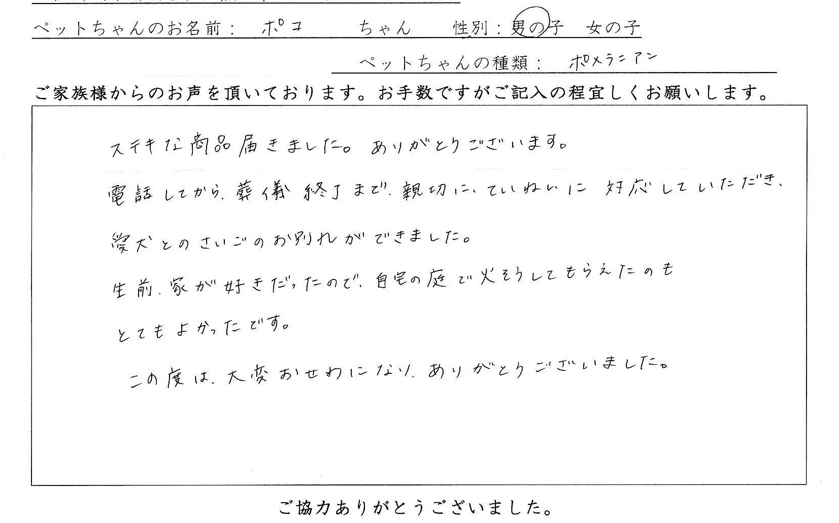 素敵な商品届きました。ありがとうございます。電話してから葬儀終了まで親切ていねいに対応していただき、愛犬とのさいごのお別れができました。生前、家が好きだったので自宅の庭で火そうしてもらえたのもとてもよかったです。この度は大変おせわになり、ありがとうございました。