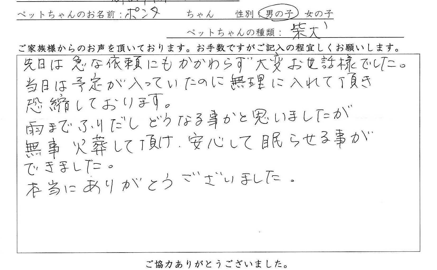 先日は急な依頼にもかかわらず大変お世話になりました。当日は予定が入っていたのに無理に入れて頂き恐縮しております。雨までふりだしどうなる事かと思いましたが、無事火葬して頂け安心して眠る事ができました。本当にありがとうございました。