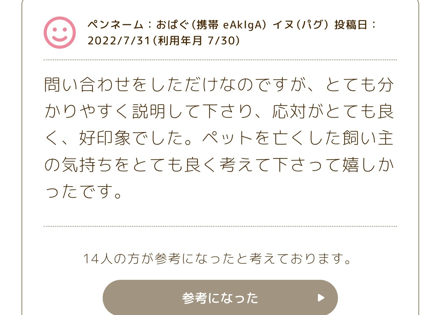 問い合わせしただけなのですが、とても分かりやすく説明して下さり、応対がとても良く、好印象でした。 ペットを亡くした飼い主の気持ちをとても良く考えて下さって嬉しかったです。
