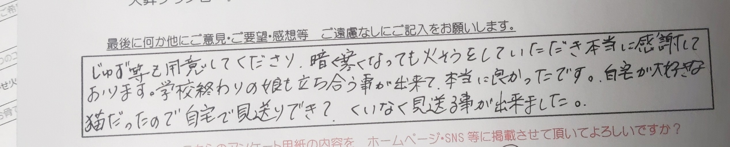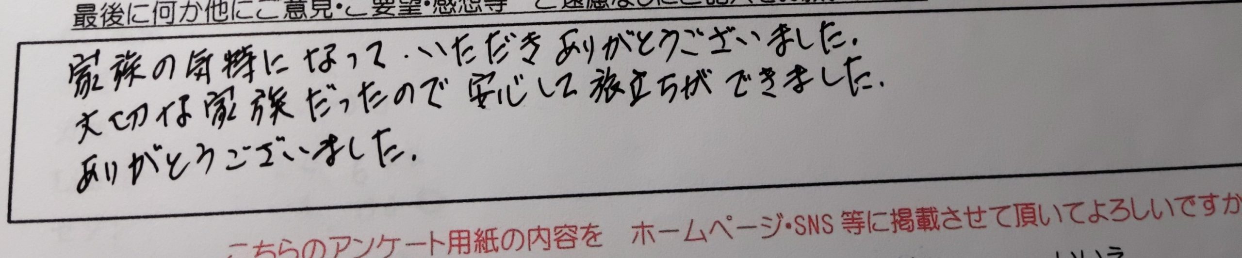 家族の気持ちになっていただきありがとうございました。 大切な家族だったので安心して旅立ちができました。 ありがとうございました。